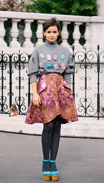 RECREATING PARIS FASHION: MIROSLAVA DUMA FLORAL BROCADE SKIRT AND CORK PLATFORMS.