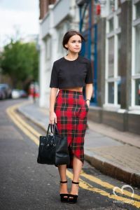 RECREATING PARIS FASHION: MIROSLAVA DUMA PLAID SKIRT AND BLACK CORK PLATFORMS.