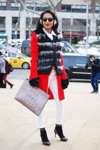 RECREATING PARIS FASHION: NAUSHEEN SHAH FUR VEST OVER A RED COAT. DRESSING AROUND A FUR VEST.