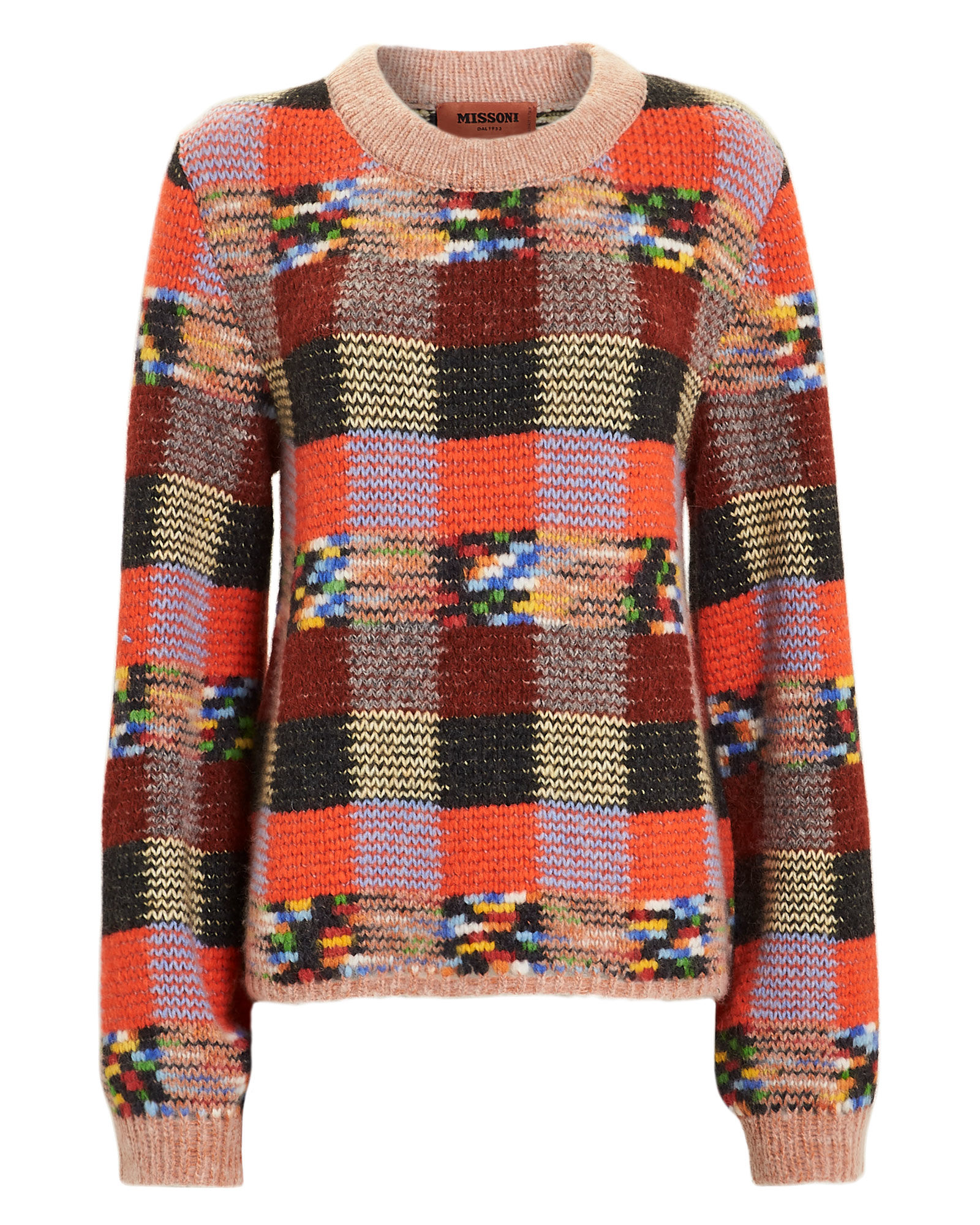 RECREATING PARIS FASHION: MIROSLAVA DUMA COLORFUL CASHMERE SWEATER AND THIGH HIGH BOOTS. COLORFUL SWEATER WITH DETAILED/COLORFUL BOOTS.