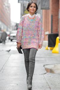 RECREATING PARIS FASHION: MIROSLAVA DUMA COLORFUL CASHMERE SWEATER AND THIGH HIGH BOOTS. COLORFUL SWEATER WITH DETAILED/COLORFUL BOOTS.