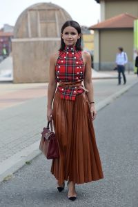 RECREATING PARIS FASHION: MIROSLAVA DUMA PLAID TOP, LEATHER PLEATED SKIRT, AND DETAILED/COLORFUL PUMPS. HOW TO PLAY AROUND WITH RED AND GREEN AT THE SAME TIME.
