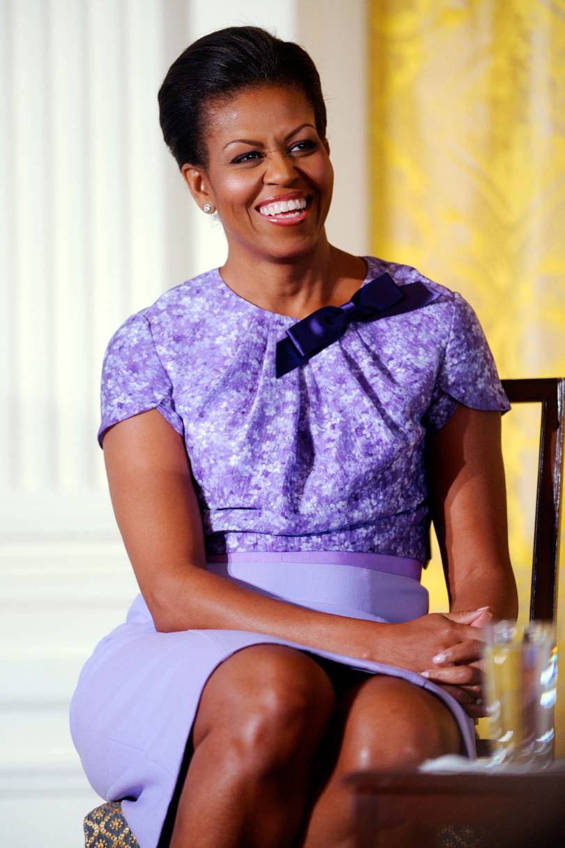 STYLING MICHELLE OBAMA PURPLE FLORAL BLOUSE AND SKIRT.