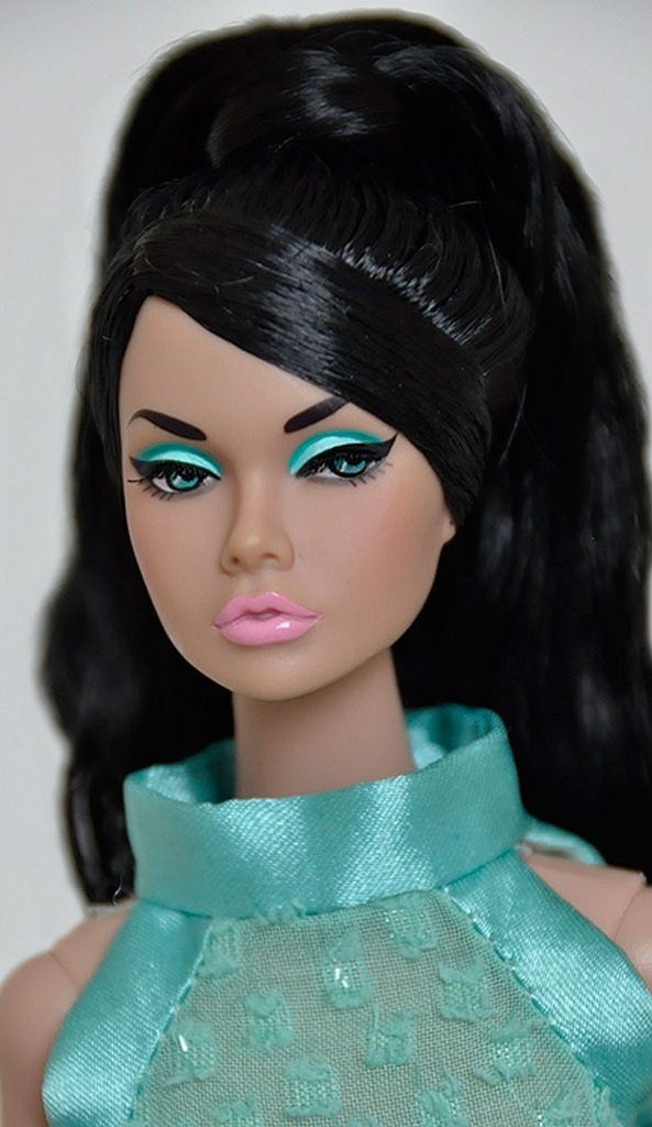 THIS POPPY BARBIE IS PICTURED, OF ARAB ETHNICITY, WITH THICK, GLOSSY BLACK HAIR, IN AN UPDO. PRINCESS JASMINE BLUE MAKEUP, TURQUOISE BLUE, TEARDROP COLORED EYES, WITH BARBIE PINK LIPGLOSS, AND TURQUOISE SLEEVELESS COLLARED DRESS.