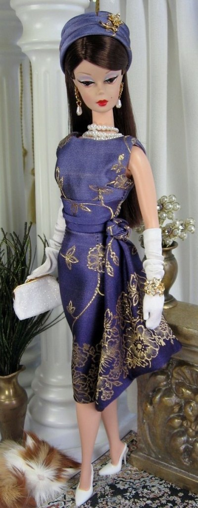 THE SILKSTONE BARBIE, PICTURE BELOW IS WEARING, MAJESTIC BLUE AND PURPLE. THE BARBIE, IS PICTURED BELOW WITH A PURPLE VINTAGE HAT, AND A GOLD BROOCH, PINNED ON THE SIDE OF IT. THAT IS THEN PAIRED, WITH GOLD PEARL CHANDELIER EARRINGS, PAIRED WITH A PEARL, FITTED NECKLACE, PAIRED WITH A PURPLE DRESS, BELTED, AND KNOTTED, ON THE SIDE, WITH GOLD, FLORAL, EMBROIDERY ALL OVER, THE DRESS, PAIRED WITH WHITE PUMPS. FOR THE ACCESSORIES, ON THE BARBIE, INCLUDE THE ELBOW LENGTH WHITE GLOVES, WITH A GOLD EMBELLISHED, CUFF BRACELET, AND A WHITE EMBELLISHED, BEADED CLUTCH BRACELET.