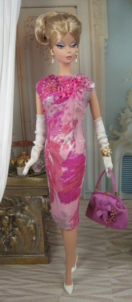 THE VINTAGE SILKSTONE BARBIE, PICTURED IS ADORNED, IN PINK EMBELLISHMENTS. AND I LITERALLY, WANT TO OWN THIS OUTFIT, AS MY OWN. THE DOLL IS PICTURED, WITH A BEAUTIFUL BLONDE UPDO, PEARL DROP EARRINGS, PAIRED WITH A PINK FLORAL PRINT DRESS, WITH DIFFERENT SHADES, OF PINK ROSES, EMBELLISHED WITH PINK BEADS. THAT IS THEN PAIRED, WITH CRISP WHITE PUMPS. FOR THE ACCESSORIES, THE BARBIE IS WEARING, LONG WHITE GLOVES, AND A MAGENTAH PINK, BEADED CLUTCH. I PAIRED A ROSE SOFT PINK HIJAB, WITH ETSY YESTERDAYSJEWELRY, PINK PEARL VINTGE CLUSTER EARRINGS, WITH BARBIE PINK NATURAL-TONE LIPGLOSS, PAIRED WITH A BALENCIAGA, PINK PRINTED BOW DRESS. THE DRESS WILL BE PAIRED, UNDERNEATH A PICCIONE PICCIONE, PINK EMBELLISHED, SLEEVELESS DRESS THE SILK PRINTED BOW, FROM THE DRESS UNDERNEATH, IS GOING TO BE PEAKING OUT, LAYERED OVER THE PINK EMBELLISHED DRESS. IT WILL BE PAIRED, WITH A PATENT BLUE HORSE BELT, PINK TIGHTS, AND PATENT BLUE PUMPS. FOR THE ACCESSORIES, I PAIRED A MATCHING BLU,E MINI BAG, AND PINK PATENT GLOVES. IN WHICH THE JEWELRY, WILL BE WORN, OVER THE GLOVES. FOR THE PIECES, OF JEWELRY, ON ONE HAND, WILL BE AN ETSY PAMSPRINGALL, MARBLE STONE BLUE CHUNKY RING, AND ETSY NATURALVIBELLCSHOP, PINK STONE BEADED BRACELETS. ON THE OTHER WRIST ALONE, WILL BE ETSY MMARCHETTIDESIGNS, BLUE RASPBERRY CANDY BRACELETS.