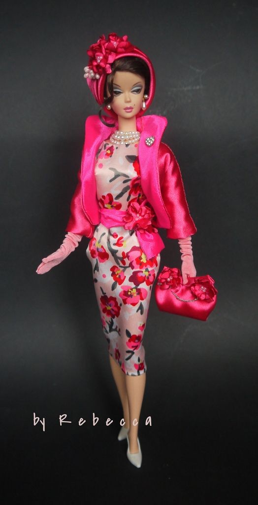THE VINTAGE SILKSTONE BARBIE, IS PICTURED IN A VERY ASIANAH, SILK PINK CHERRY BLOSSOM STYLE OUTFIT. AND I ABSOLUTELY LOVE IT. I LOVE THE DIFFERENT GARMENTS, IN THE ASIAN CULTURES. SO I WAS VERY EXCITED, TO DO THIS ONE. THE BARBIE IS PICTURED, WITH HOT-BARBIE PINK CHERRY BLOSSOM, PEARL EMBELLISHED TURBAN-STYLE HAT, PAIRED WITH PINK PEARL DROP EARRINGS. FOR THE OUTFIT, THE BARBIE IS WEARING, A SILK CROPPED BLAZER/JACKET, WITH A BROOCH ON THE COLLAR. AND FITTED LIGHT BABY PINK PEARL NECKLACE. THE SILK BLAZER IS OPEN, OVER A PINK SILK CHERRY BLOSSOM PRINTED DRESS, AND PEARL WHITE PUMPS. FOR THE ACCESSORIES, PAIRED ON THE BARBIE, THAT FINISHES THE LOOK OFF, ARE THE LONG PINK GLITTERED GLOVES, HOLDING A PEARL EMBELLISHED, HOT BARBIE-PINK CHERRY BLOSSOM CLUTCH, THAT REALLY COMPLIMENTS, THE PRINT OF THE DRESS. WHILE BRINGING TOGETHER, ALL OF THE SHADES, OF PINK, AND MAKING THE DETAIL,OF CREAMY IVORY PEARL PREVALENT.