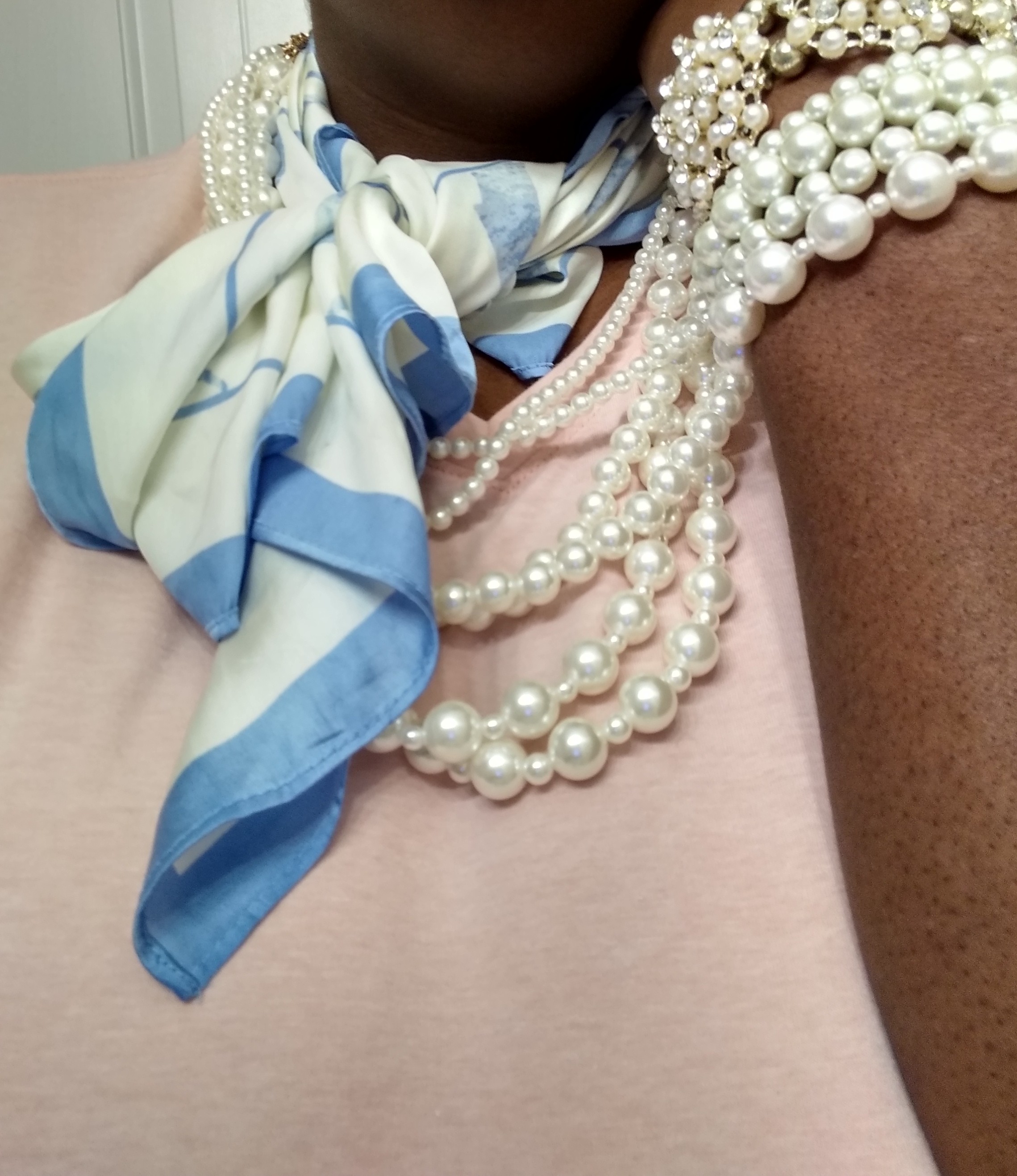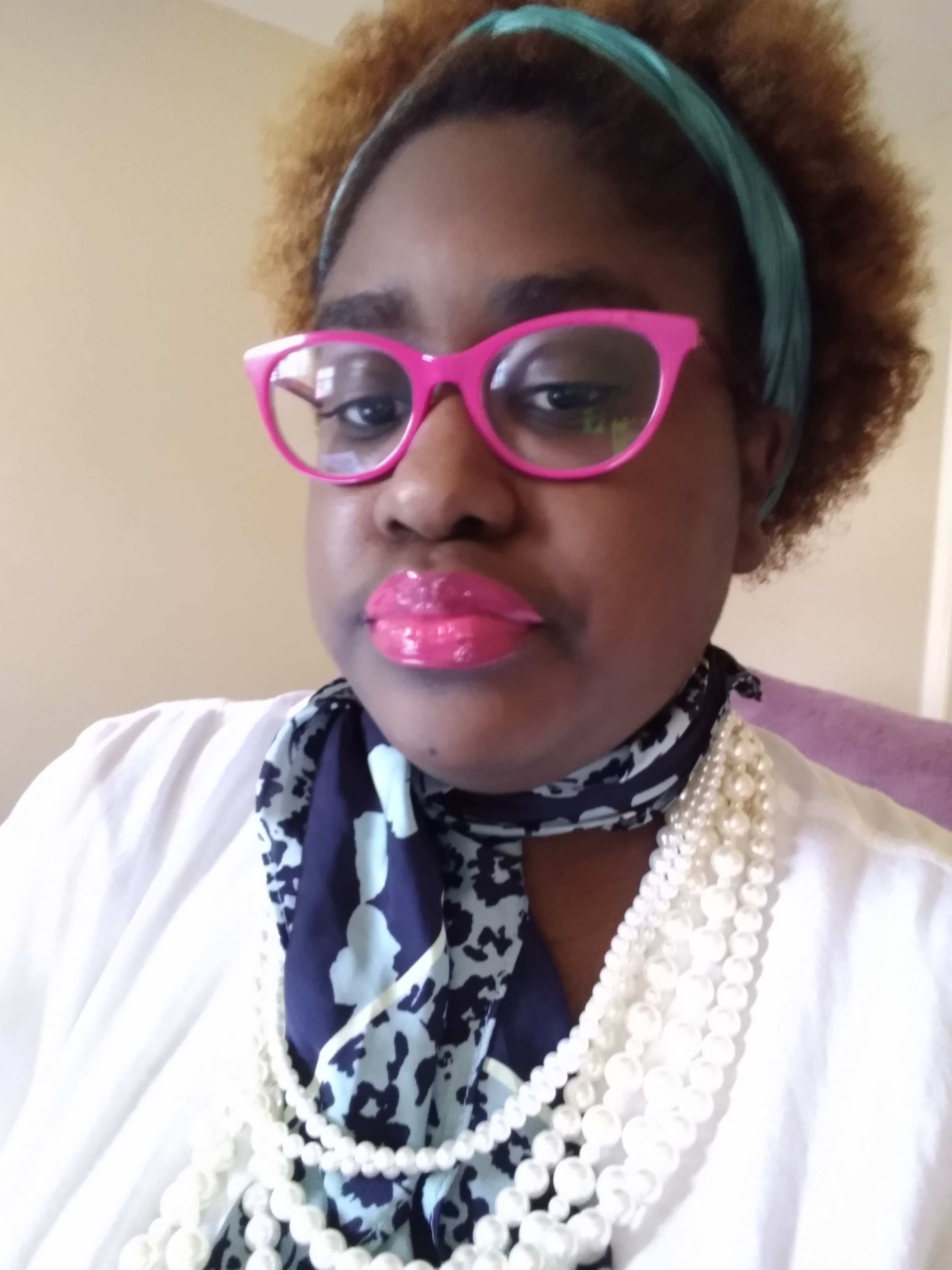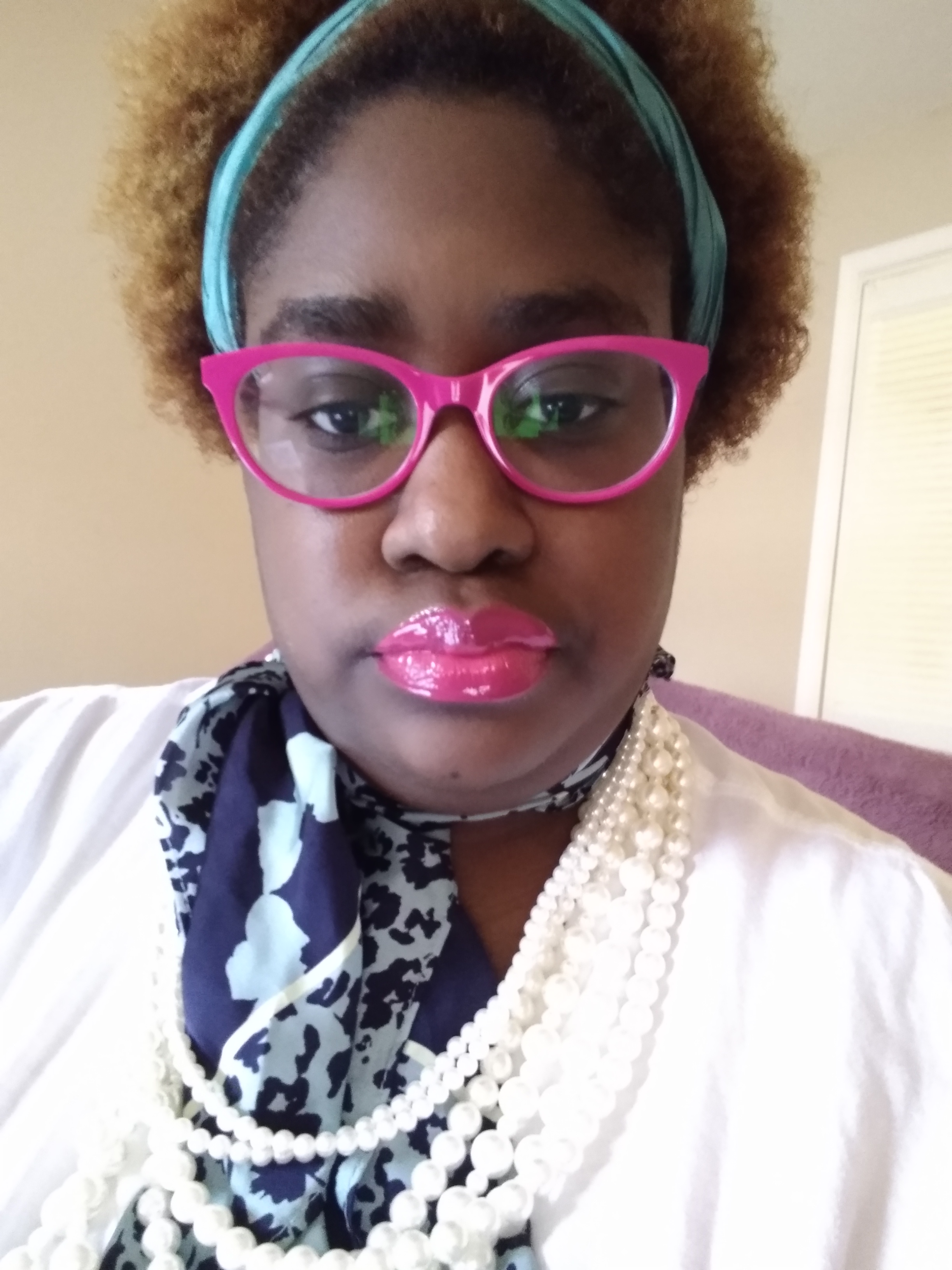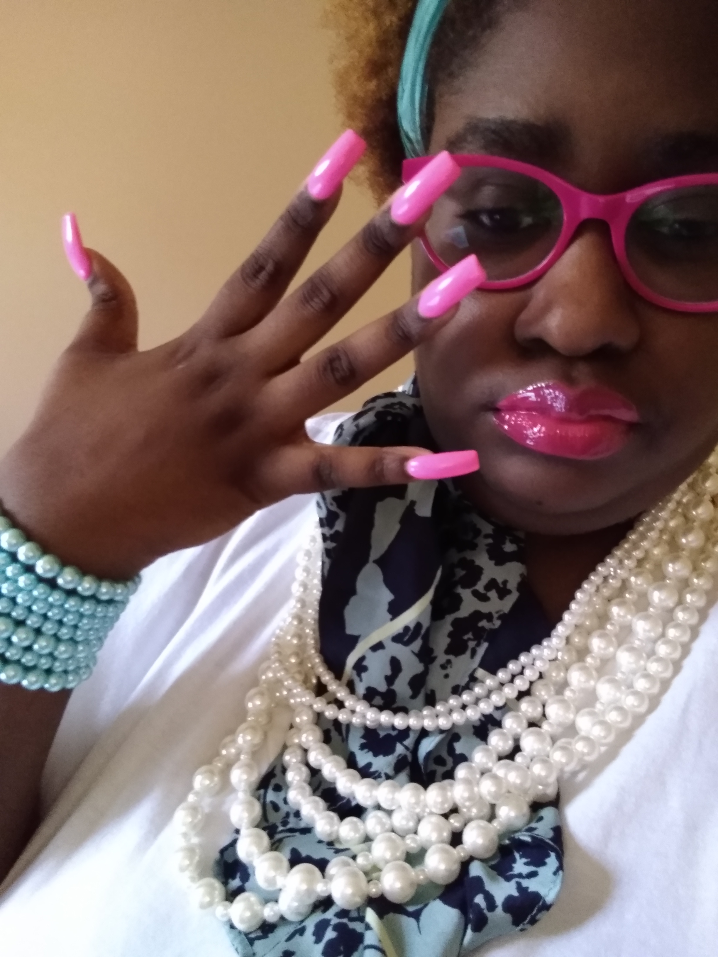 WHY NOT WEAR A NECKTIE SCARF, AND DRAPE NECKLACES, ON IT OR AROUND IT. ITS DIFFERENT I KNOW, BUT ALSO SOMETHING SO SLEEK ABOUT IT, SO OVERLY OVER THE TOP! WITH ACCESSORIES, THAT IT COMMANDS ATTENTION, AND PLENTY OF ROOM, TO PLAY AROUND, WITH A PRIMARY COLOR. THAT BRINGS THE COLOR, OF THE SCARF OUT. WHILE ALSO ADDING, A BURT OF BOLD COLOR, LIKE FOR EXAMPLE, HOT-PINK CATEYE GLASSES, WITH BARBIE HOT-PINK LIPS.