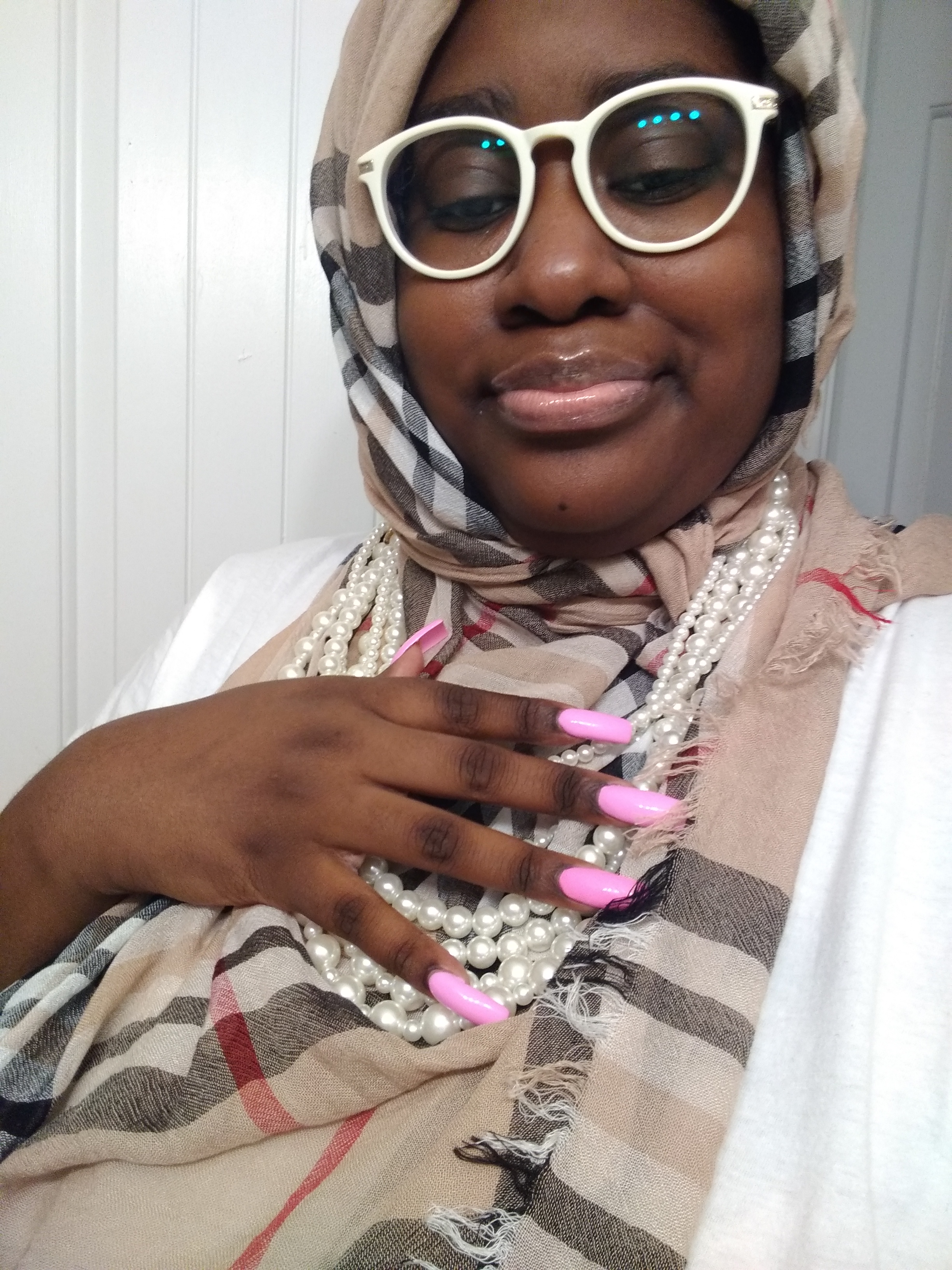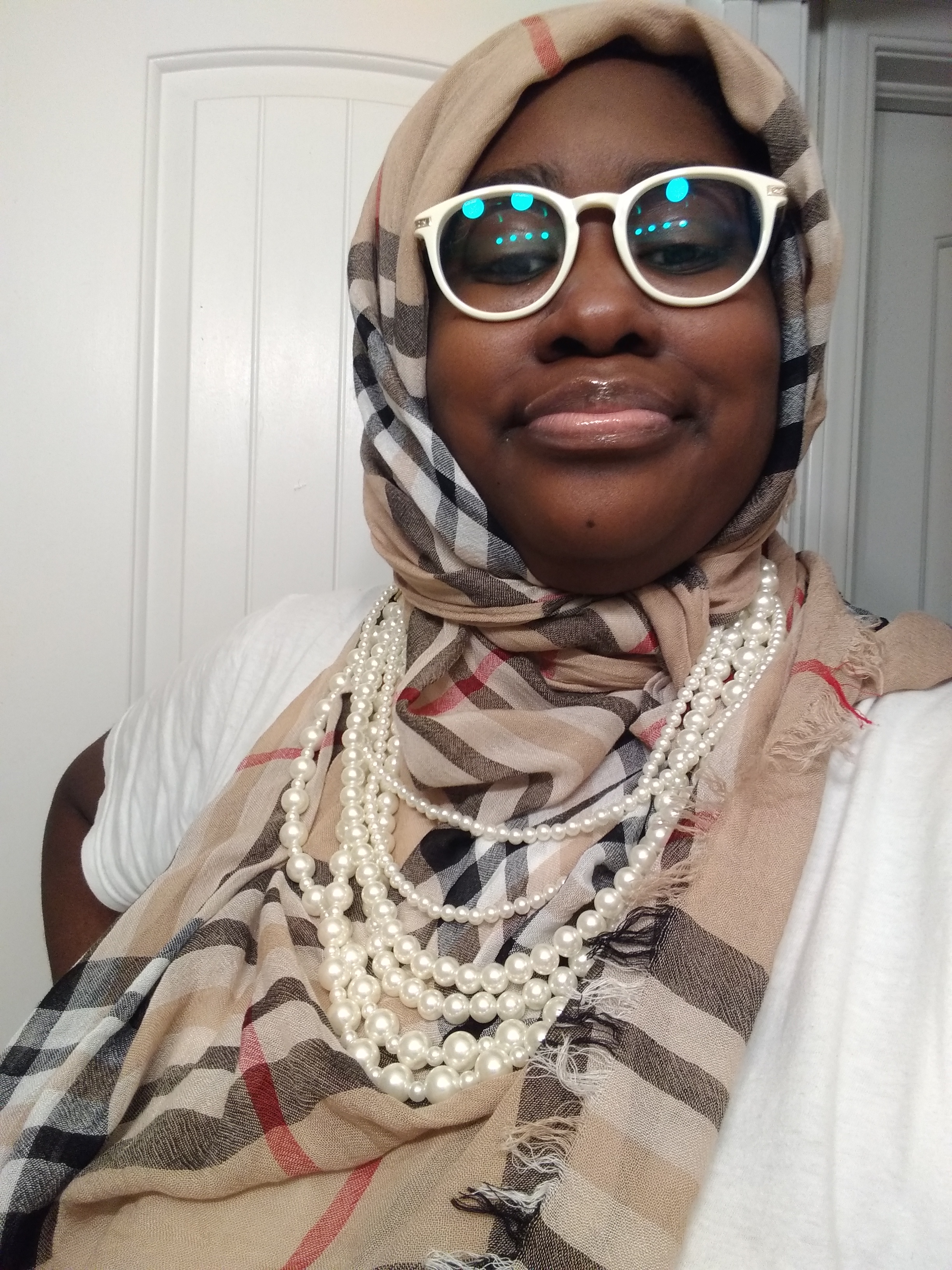 TARA 101: NOT ONLY DOES WHITE GLASSES GO WITH ANYTHING. BUT DIFFERENT SHADES, OF BROWN GLASSES, GO WITH ANY, AND EVERYTHING, AS WELL. GET OUT OF THE MINDSET, THAT BLACK IS THE ONLY COLOR, THAT GOES WITH EVERYTHING. BECAUSE ALOT OF TIMES INSTEAD OF MAKING A BOLD APPEARANCE, IT GIVES OFF, A DARK SORT OF VIBE IF YOUR PAIRING IT WITH ANOTHER COLOR, THE HUE OF THAT COLOR DARKENS, THE MOOD, FOR A MORE CORGIAL CASUAL LOOK, INSTEAD OF HELPING THE OUTFIT COME TO LIFE. ITS NOT THE ONLY COLOR THATS ALWAYS NEEDED OR THE GO TO COLOR, TO PAIR, A SIMPLE DRESS SHIRT WITH SOME PANTS. LIKE WHITE GLASSES, IT WORKS THE SAME, WITH WHITE PIECES, IN YOUR STYLE. MOVING ON NOW, YES HIJABS, SHOULD BE ADORNED, WITH NECKLACES, DOESN’T, HAVE TO BE PEARLS. BUT DRAPED, BIB LIKE NECKLACES, EVERYTIME YOU WEAR, THE VARIETY OF THE ONES, OF OTHER COLORS, THAT YOU HAVE. IT’S A VIBE GIRL, TRUST AND BELIEVE. YOU CAN GET, THAT NECKLACE, MATCH IT, WITH OTHER ACCESSORIES, ALONG WITH YOUR HIJAB, AND YOUR GOOD TO GO!