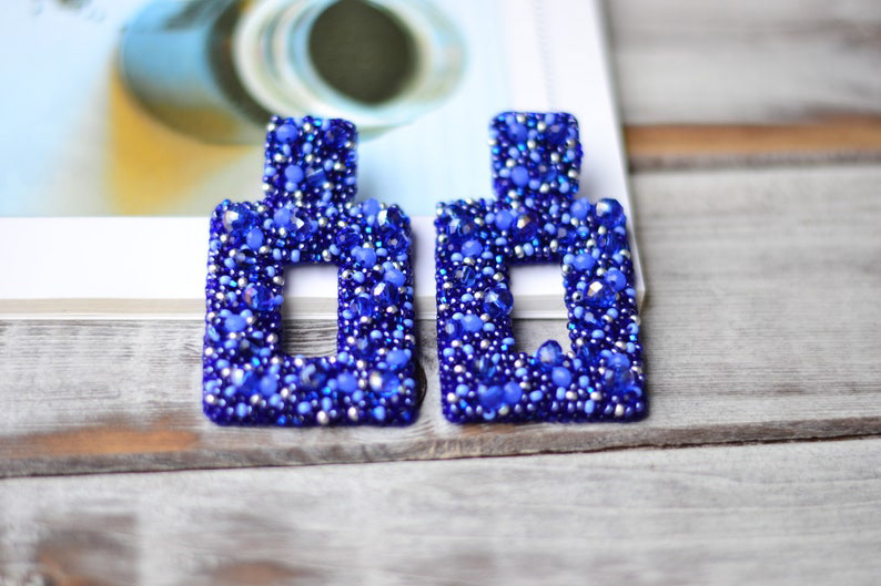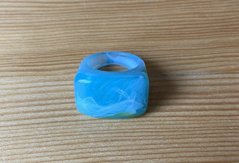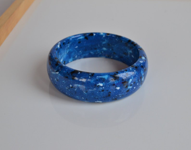FOR THE JEWELRY, I PAIRED ETSY UKRAINIANJEWELRYSHOP, BLUE SQUARE BEADED CRYSTAL EARRINGS. FOR BOTH WRISTS, I PAIRED ON ONE AN ETSY, SNAZZYDECODESIGNS, BLUE CHUNKY BRACELET, WITH AN ETSY GLORYDAYZ, WATER-BLUE MARBLE RING. ON THE OTHER WRIST, I KEPT IT SIMPLE, AND PAIRED, ETSY PINKLILASHOP, BLUE MARBLED BANGLE.
