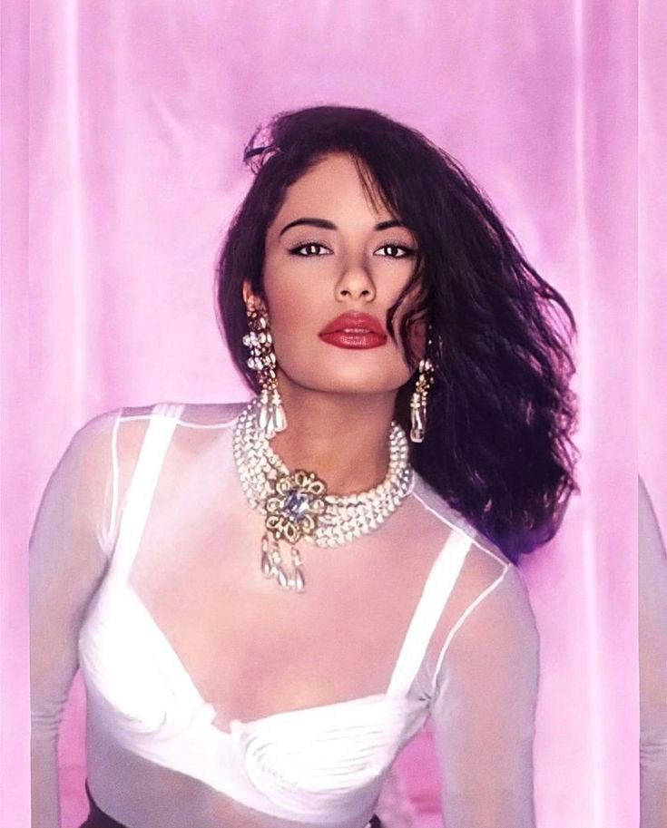 EVERYONE WHO KNOWS ASHELENIAH, SELENA, OR WHO KNOWS, ONE THING ABOUT HER, WAS HER IMPACT IN FASHION. SHE PAIRED, HER VINTAGE PEARL PIECES, WITH THIS PICTURED OUTFIT. THE CHUNKY PEARL CHANDELIER EARRINGS, WITH THE MATCHING CHOKER NECKLACE. SO I RECREATED, THE WHITE TOP, WITH THE WHITE BRA. I PAIRED BLONDE CURLY HAIR, WITH BARBIE PINK LIPSTICK, ETSY CHUNKY, SILVER-PEARL, CHANDELIER EARRINGS, ETSY DEWYTREASURES, VINTAGE PEARL CHOKER, TO MATCH THE EARRINGS. I PAIRED, THE JEWELRY, WITH A SILK, WHITE BLOUSE. THAT WILL BE PAIRED, UNDERNEATH AN ETSY ICYBUNNYZ, CRYSTAL BRA TOP. THAT I PAIRED, WITH WHITE, HIGH- WAISTED TROUSERS, SHEER BLACK TIGHTS, AND METALLIC BLUE PUMPS. FOR SOME INTENSE COLOR, TO REALLY, MAKE THE BRA JUST GLEAM, I PAIRED MATCHING CHROME BLUE, METALLIC NAILS, AS AN ACCESSORY TO THE OUTFIT,