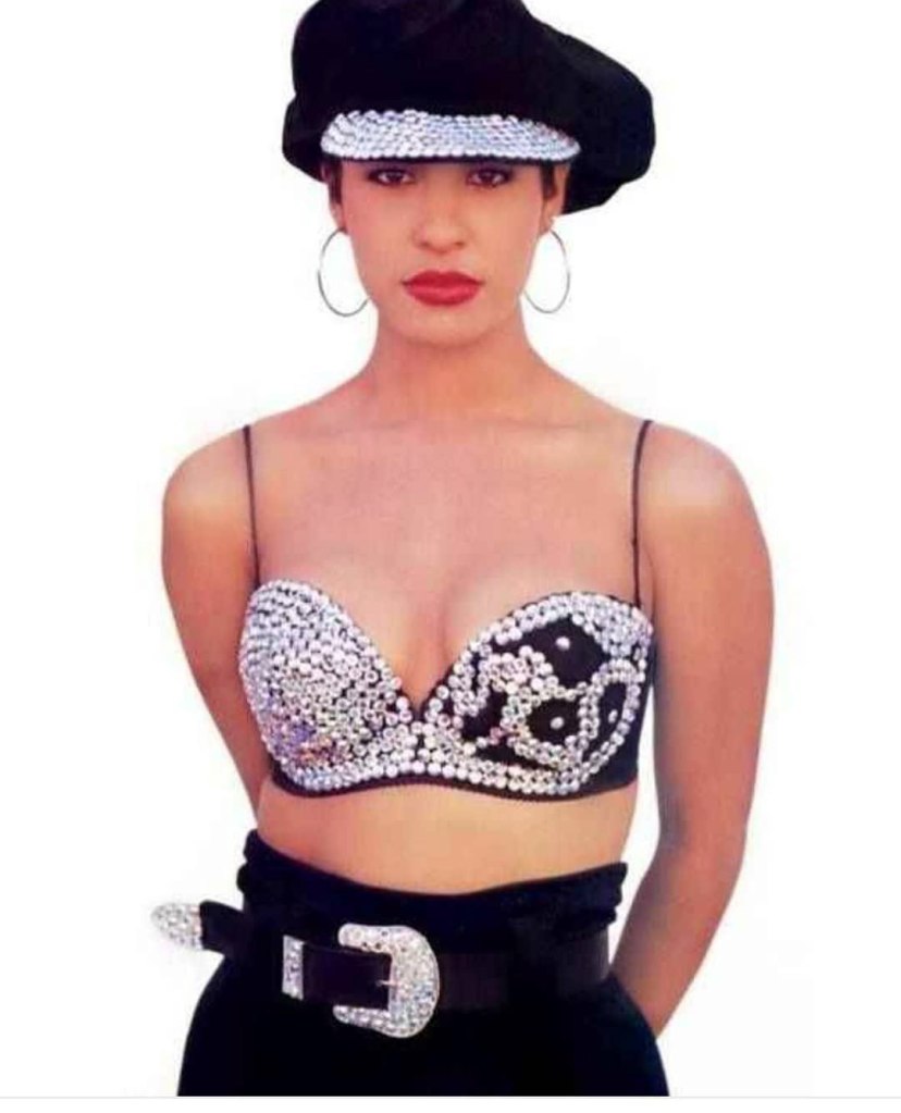 I RECREATED, ONE OF ASHELENIAH QUINTANILLAHAH’S, MOST CLASSIC LOOKS, AND A THROWBACK, TO HER MANY CRYSTAL BUSTIERS, THAT SHE WOULD CREATE. BUT THIS IS JUST, CLASSIC SELENA, THE FASHIONISTA. SO I HAD TO RECREATE, THIS OUTFIT. I PAIRED A LEOPARD, MILITARY HAT, WITH ETSY TWEEACCESSORIES, ORANGE CHANDELIER EARRINGS, THAT I PAIRED WITH, A VALENTINO, BLUE LEOPARD PRINT SHIRT, THAT WILL BE PAIRED, UNDERNEATH A CRYSTAL WARDROBE, BLACK AND SILVER, MOSAIC, MIRRORED BUSTIER. THAT I PAIRED, WITH A SOFT ORANGE BELT, WRAPPED AROUND THE TORSO. I PAIRED, THE OUTFIT, WITH BROWN LEOPARD PRINT PANTS, AND KNEE-HIGH, COW PRINT BOOTS.