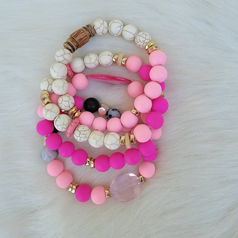 FOR THE ACCESSORIES, TO GO ALONG, WITH THE COLOR-SCHEME, AND TOO REALLY SET, THE DIFFERENT SHADES, OF BLUE, AND GREEN, WERE PLAYING WITH HERE. I WENT WITH MY BRIGHT BLUE NAILS, AN ETSY KOUTUREE, MATCHING BLUE MARBLE STONE RING, WITH ETSY FEARLESSBYIBANEZ, BARBIE PINK BEAD CRYSTAL STACKED BRACELETS. AND ON THE OTHER HAND, I PAIRED ETSY TERRYSATTICTREASURES, PINK CUFF BRACELET, AND ETSY KELSEYBELMONTDESIGNS, CHUNKY BARBIE-PINK, CANDY-EFFECT BRACELETS. TO COMPLETE THIS PERFORMANCE OUTFIT, I PAIRED A SIGNATURE BARBIE PINK CRYSTAL MICROPHONE.