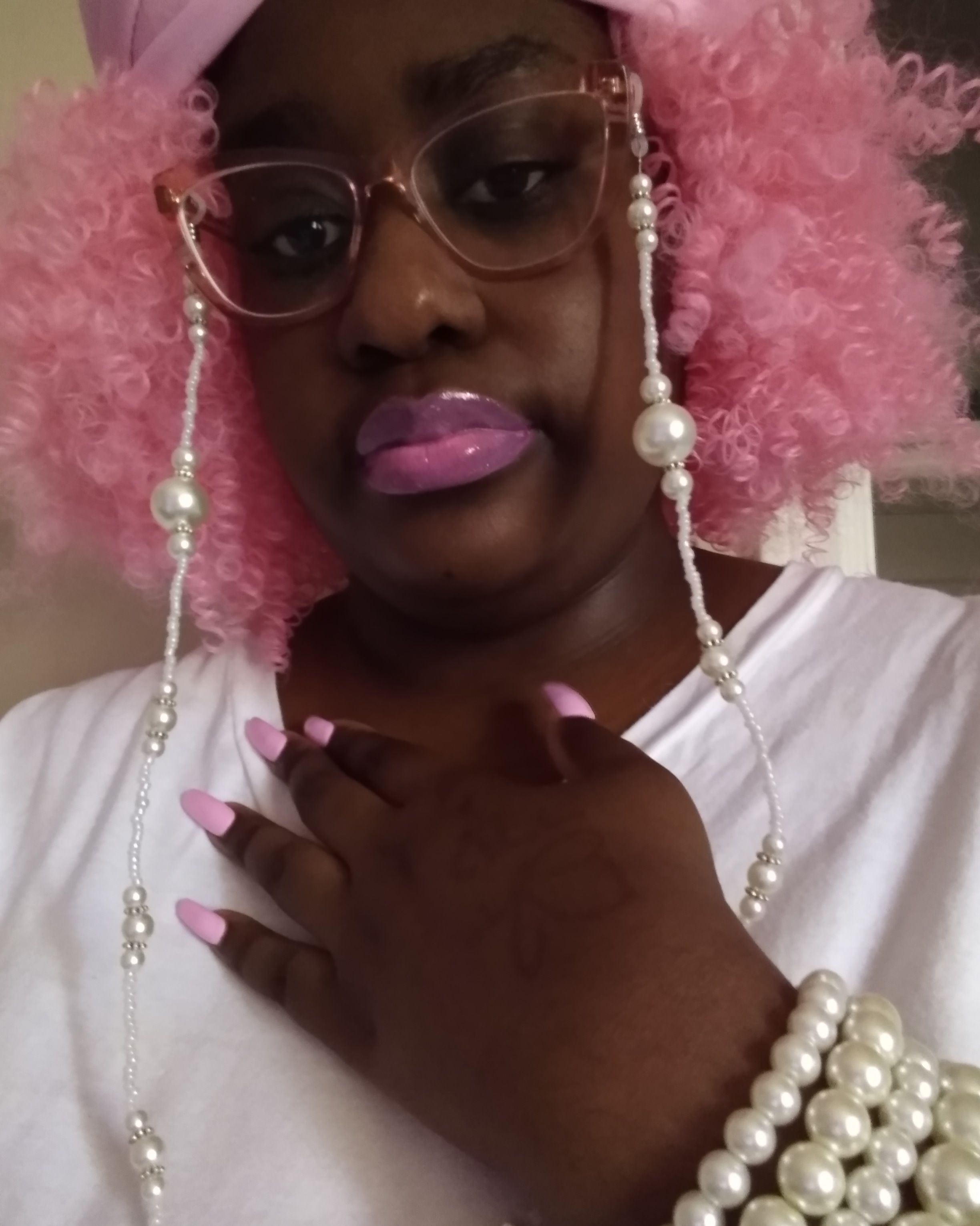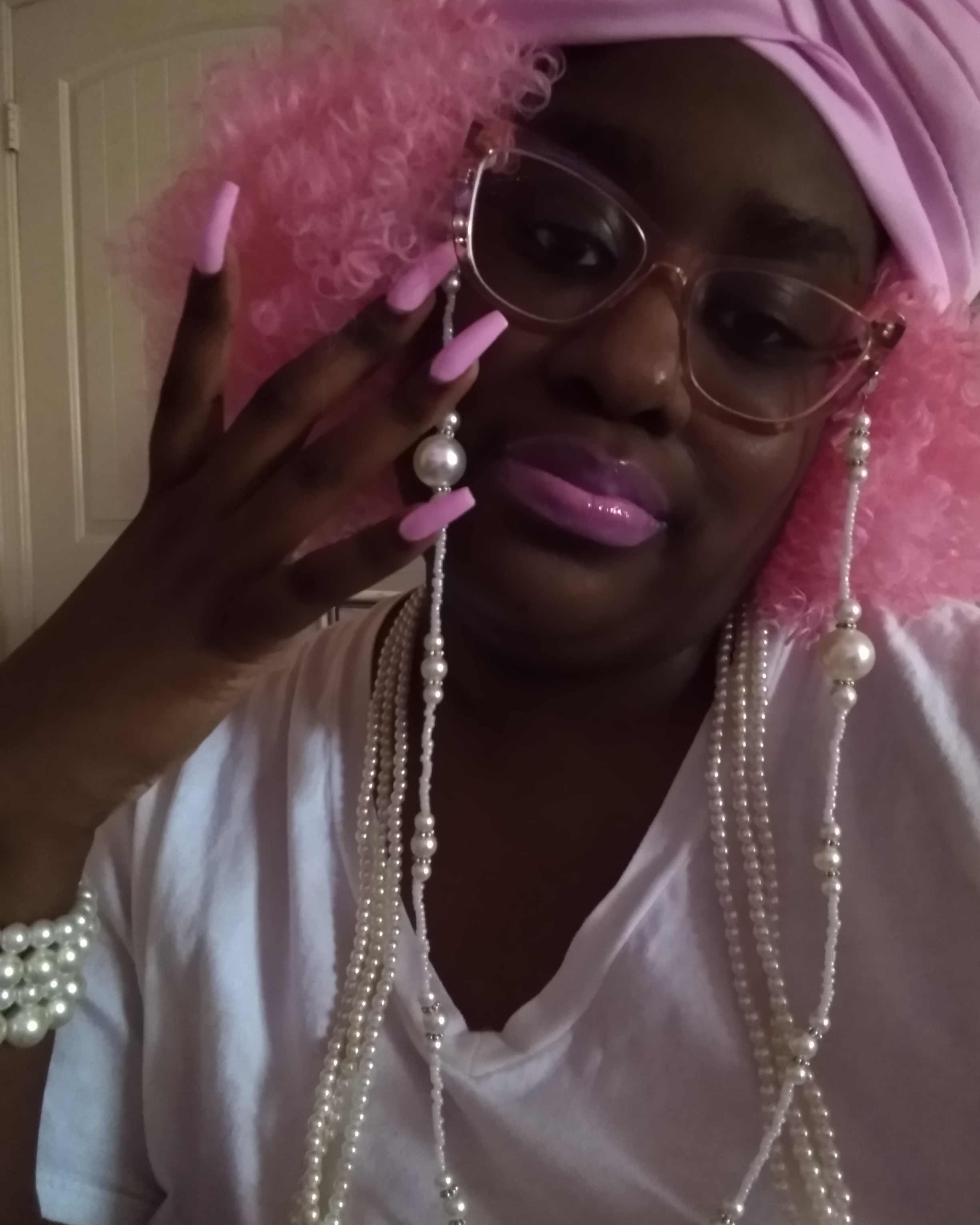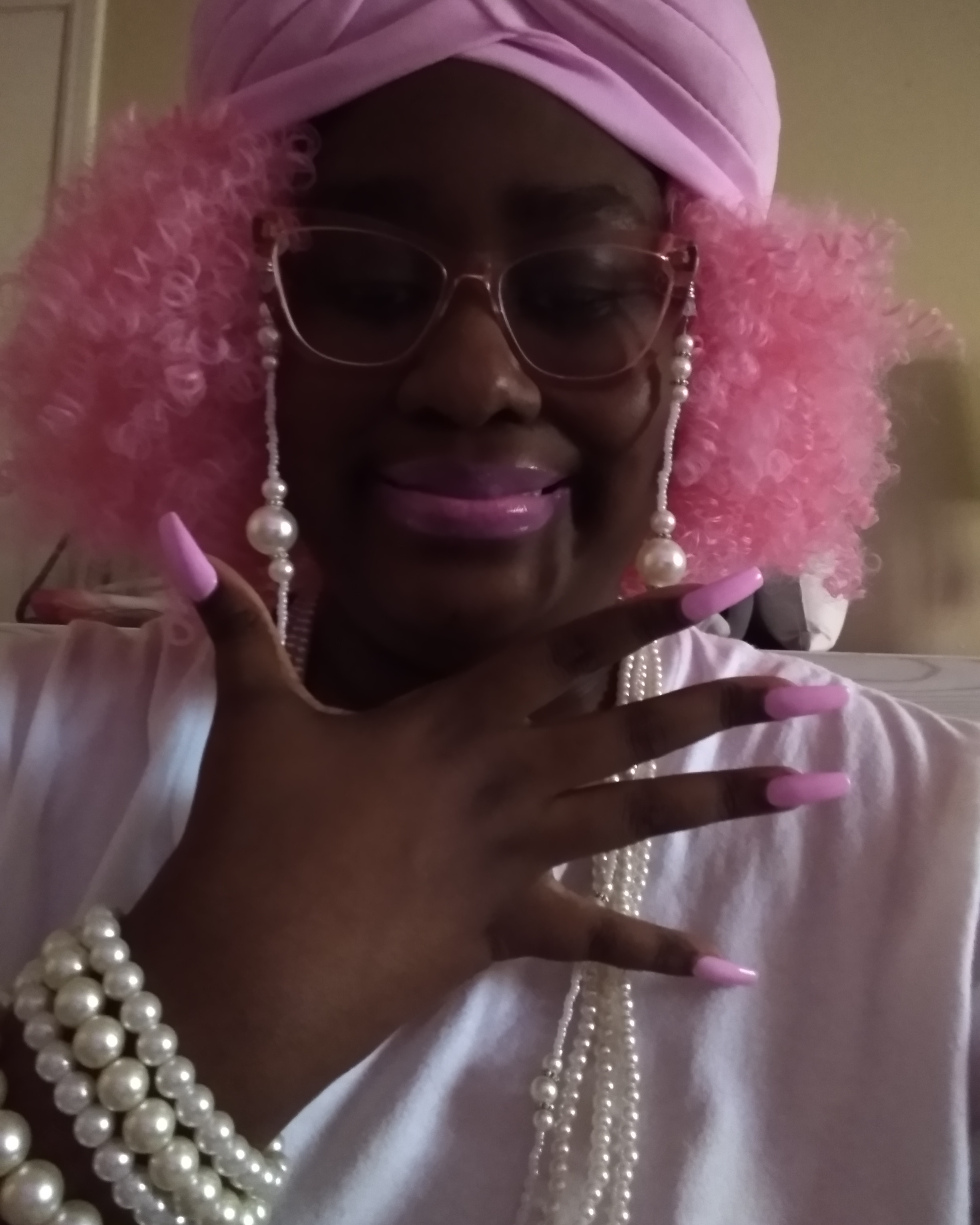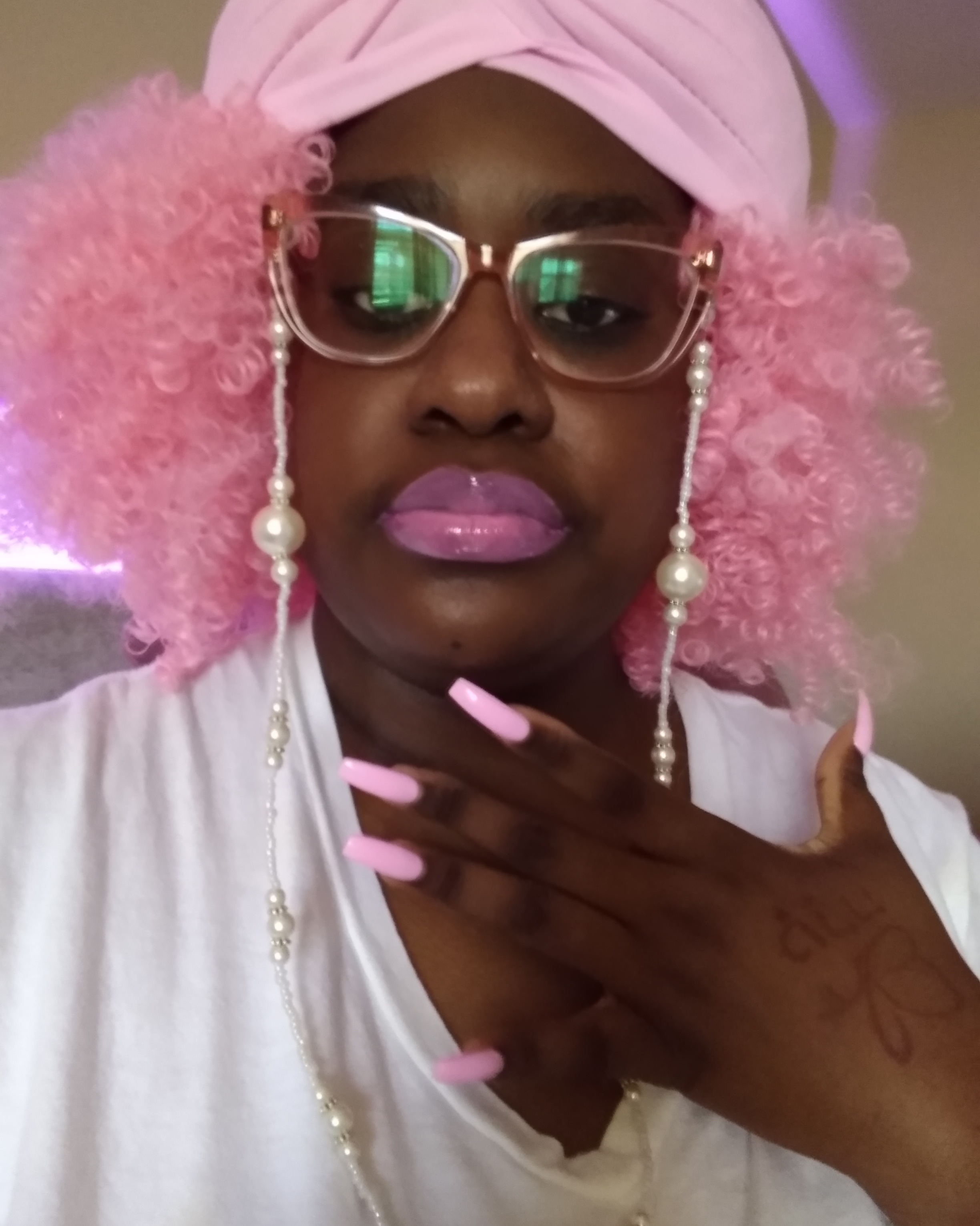 I’M OBSESSED, WITH THE COLOR PINK, EVERY SINCE, I WAS A LITTLE GIRL. AND I APPLAUD, ALL THOSE, WHO HAVE PINK, AS THERE FAVORITE COLOR TO, WEARING IT MODESTLY, NOT TRYING TO SEXUALIZE, SUCH AN INNOCENT, BEAUTIFUL COLOR, OF THIS GENERATION. I APPLAUD YOU, AND YOU LOOK GREAT, WITH A COLOR, THAT SPEAKS TO YOU. IT’S NICE SHARE, THE SAME COMPASSION FOR THE SIMILARITIES, OF THINGS, OF PINK, OF WHICHEVER, SHADE OF PINK, WITH SOMEONE, WHO’S FAVORITE COLOR, IS ALSO PINK. THERE ARE PLENTY OF SHADES, OF BARBIE-PINK TO GO AROUND. THAT GOD HATH MADE. GOD DID’NT MAKE PINK. FOR ONE PERSON, OR CELEBRITIES, FAMOUS IDOLS, TO CLAIM, AS THOUGH, THEY ARE THE BEGINNING, AND THE END, OF FASHION TRENDS, OR COLORS, BEING THOUGHT OF. FOR EXAMPLE, BARBIE DOLLS, FOR ONE TYPE OF GIRL, THAT’S NOT RIGHT. ONE PORTRAYAL TO MAKE THE REST, OF ALL OTHER GIRLS, OF DIFFERENT ETHNICITIES, AND SHADES, FEEL NOT INCLUDED, IN SELF-REPRESENTATION, FOR MANY DECADES. BUT MERELY, SHOULD BE THOUGHT, OF BY GOD, AS THE CREATOR OF THIS BEAUTIFUL COLOR, AND ALL THE FASHION TRENDS, LIKE PINK HAIR, PINK NAILS, PINK LIPGLOSS AND LIPSTICK, PINK BEAUTY. ALL OF THAT COMES, WITH THIS COLOR. FOR ALL ETHNICITIES, AND CULTURES OF GIRLS, AND WOMEN, FROM AROUND THE WORLD. SO IT’S NO WONDER, WHY THIS COLORS, MAKES EVERY GIRL FEEL PRETTY, LIKE A BARBIE DOLL. SO I DECIDED TO DO A PHOTO SERIES, WITH MY FAVORITE COLOR: PINK. I HAVE A PINK TURBAN, PAIRED WITH CURLY, KINKY, BARBIE-PINK HAIR, WITH LAVENDER- BARBIE PINK LIPSTICK, AND PASTEL BARBIE PINK NAILS. FOR THE REST, OF THE ACCESSORIES, I PAIRED A PEARL EYEGLASS CHAIN, WITH A KNOTTED PEARL NECKLACE, AND PEARL BRACELETS STACK, WITH MY METALLIC ROSE-GOLD GLASSES. THANKS YESHUDAH, YESHUA, JEJESUAH, JESUS…AB’BAH FOR THE CREATION, OF THE COLOR PINK, AND YOUR KNOWLEDGE, OF ORGINALITY, AND CREATIVITY, OF THE MANY WAYS, PINK MAKES A GIRLS LIKE ME HAPPY.