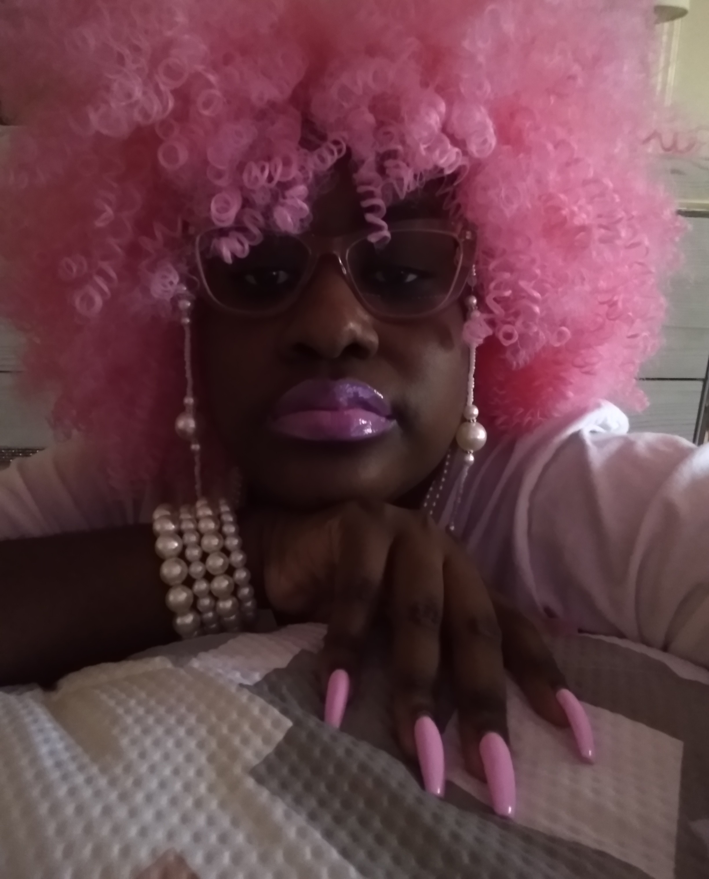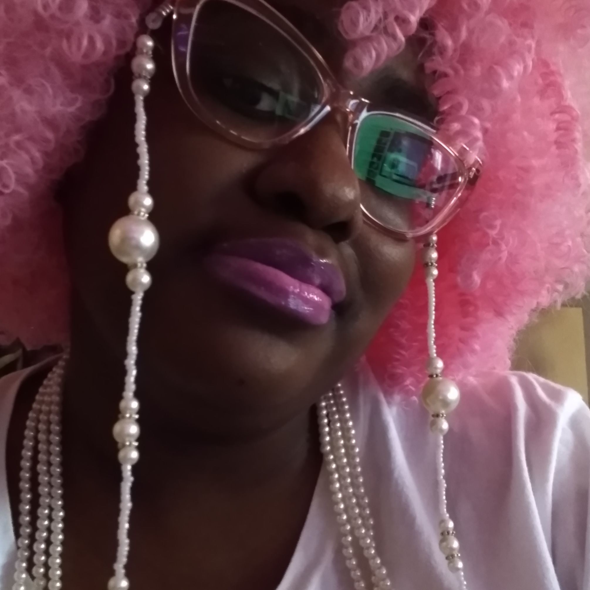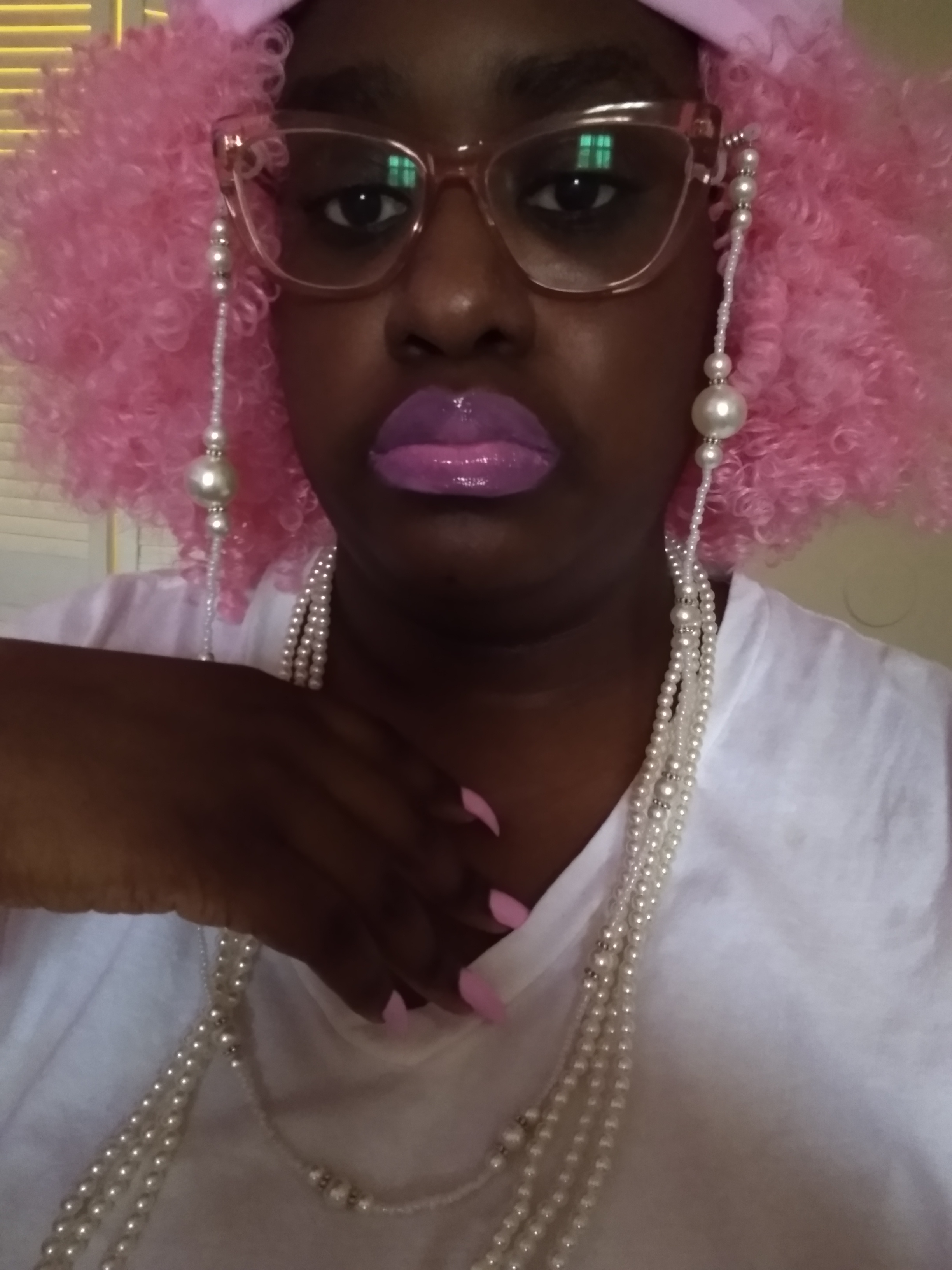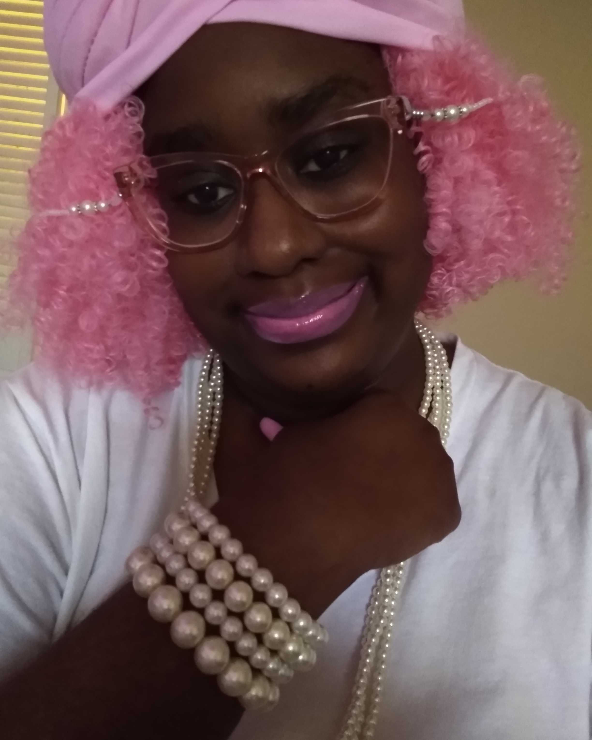 I’M OBSESSED, WITH THE COLOR PINK, EVERY SINCE, I WAS A LITTLE GIRL. AND I APPLAUD, ALL THOSE, WHO HAVE PINK, AS THERE FAVORITE COLOR TO, WEARING IT MODESTLY, NOT TRYING TO SEXUALIZE, SUCH AN INNOCENT, BEAUTIFUL COLOR, OF THIS GENERATION. I APPLAUD YOU, AND YOU LOOK GREAT, WITH A COLOR, THAT SPEAKS TO YOU. IT’S NICE SHARE, THE SAME COMPASSION FOR THE SIMILARITIES, OF THINGS, OF PINK, OF WHICHEVER, SHADE OF PINK, WITH SOMEONE, WHO’S FAVORITE COLOR, IS ALSO PINK. THERE ARE PLENTY OF SHADES, OF BARBIE-PINK TO GO AROUND. THAT GOD HATH MADE. GOD DID’NT MAKE PINK. FOR ONE PERSON, OR CELEBRITIES, FAMOUS IDOLS, TO CLAIM, AS THOUGH, THEY ARE THE BEGINNING, AND THE END, OF FASHION TRENDS, OR COLORS, BEING THOUGHT OF. FOR EXAMPLE, BARBIE DOLLS, FOR ONE TYPE OF GIRL, THAT’S NOT RIGHT. ONE PORTRAYAL TO MAKE THE REST, OF ALL OTHER GIRLS, OF DIFFERENT ETHNICITIES, AND SHADES, FEEL NOT INCLUDED, IN SELF-REPRESENTATION, FOR MANY DECADES. BUT MERELY, SHOULD BE THOUGHT, OF BY GOD, AS THE CREATOR OF THIS BEAUTIFUL COLOR, AND ALL THE FASHION TRENDS, LIKE PINK HAIR, PINK NAILS, PINK LIPGLOSS AND LIPSTICK, PINK BEAUTY. ALL OF THAT COMES, WITH THIS COLOR. FOR ALL ETHNICITIES, AND CULTURES OF GIRLS, AND WOMEN, FROM AROUND THE WORLD. SO IT’S NO WONDER, WHY THIS COLORS, MAKES EVERY GIRL FEEL PRETTY, LIKE A BARBIE DOLL. SO I DECIDED TO DO A PHOTO SERIES, WITH MY FAVORITE COLOR: PINK. I HAVE A PINK TURBAN, PAIRED WITH CURLY, KINKY, BARBIE-PINK HAIR, WITH LAVENDER- BARBIE PINK LIPSTICK, AND PASTEL BARBIE PINK NAILS. FOR THE REST, OF THE ACCESSORIES, I PAIRED A PEARL EYEGLASS CHAIN, WITH A KNOTTED PEARL NECKLACE, AND PEARL BRACELETS STACK, WITH MY METALLIC ROSE-GOLD GLASSES. THANKS YESHUDAH, YESHUA, JEJESUAH, JESUS…AB’BAH FOR THE CREATION, OF THE COLOR PINK, AND YOUR KNOWLEDGE, OF ORGINALITY, AND CREATIVITY, OF THE MANY WAYS, PINK MAKES A GIRLS LIKE ME HAPPY.