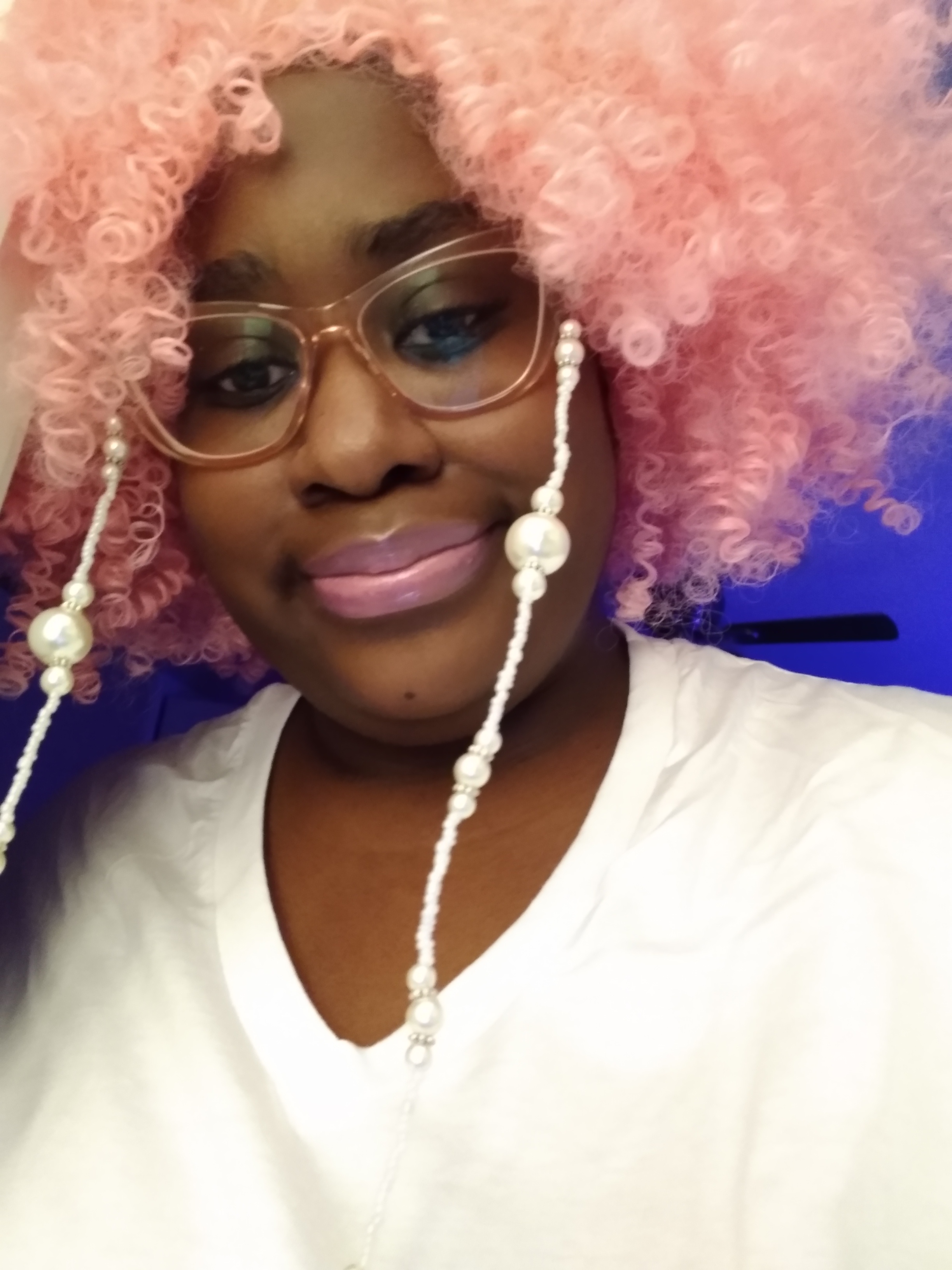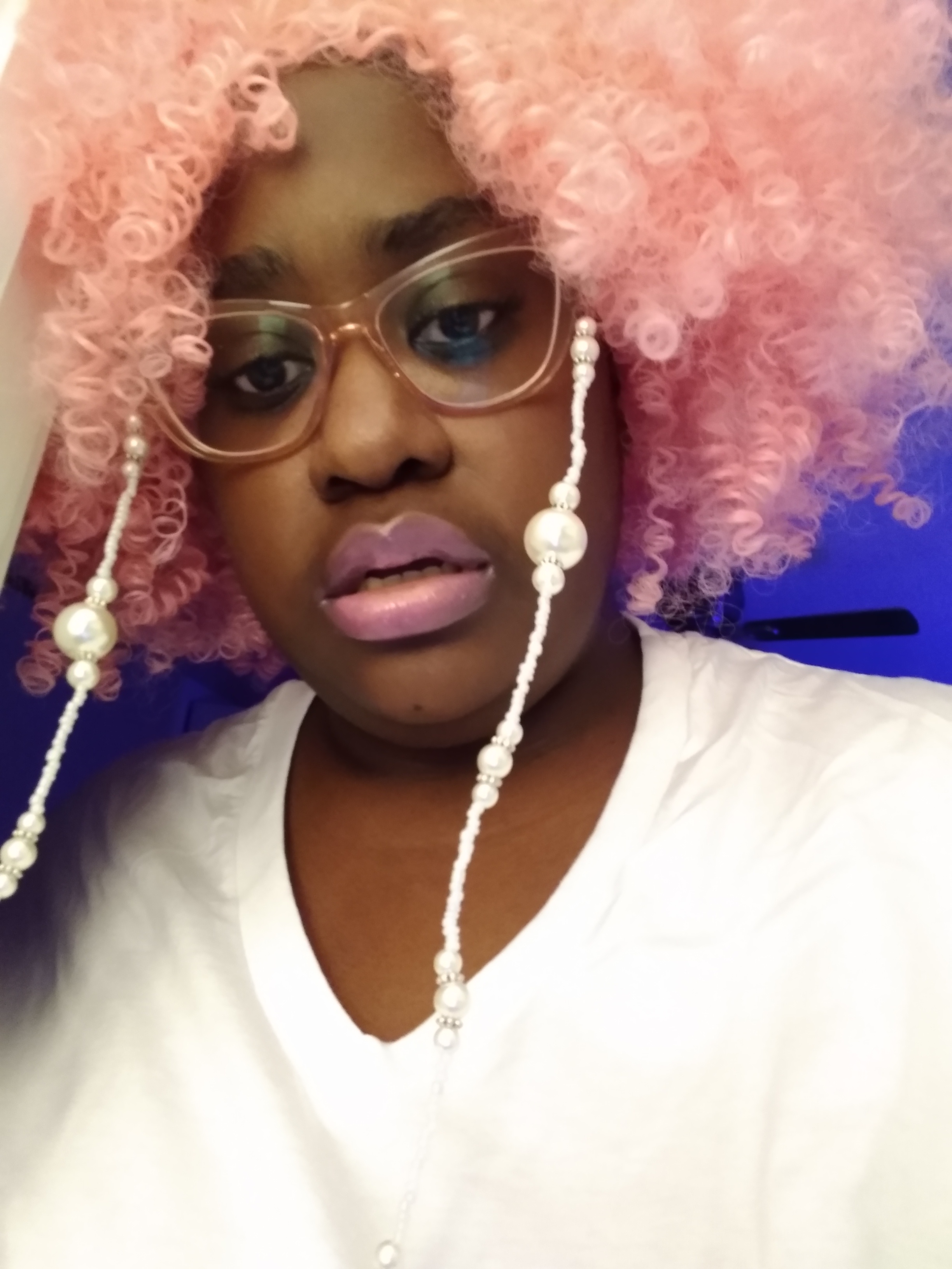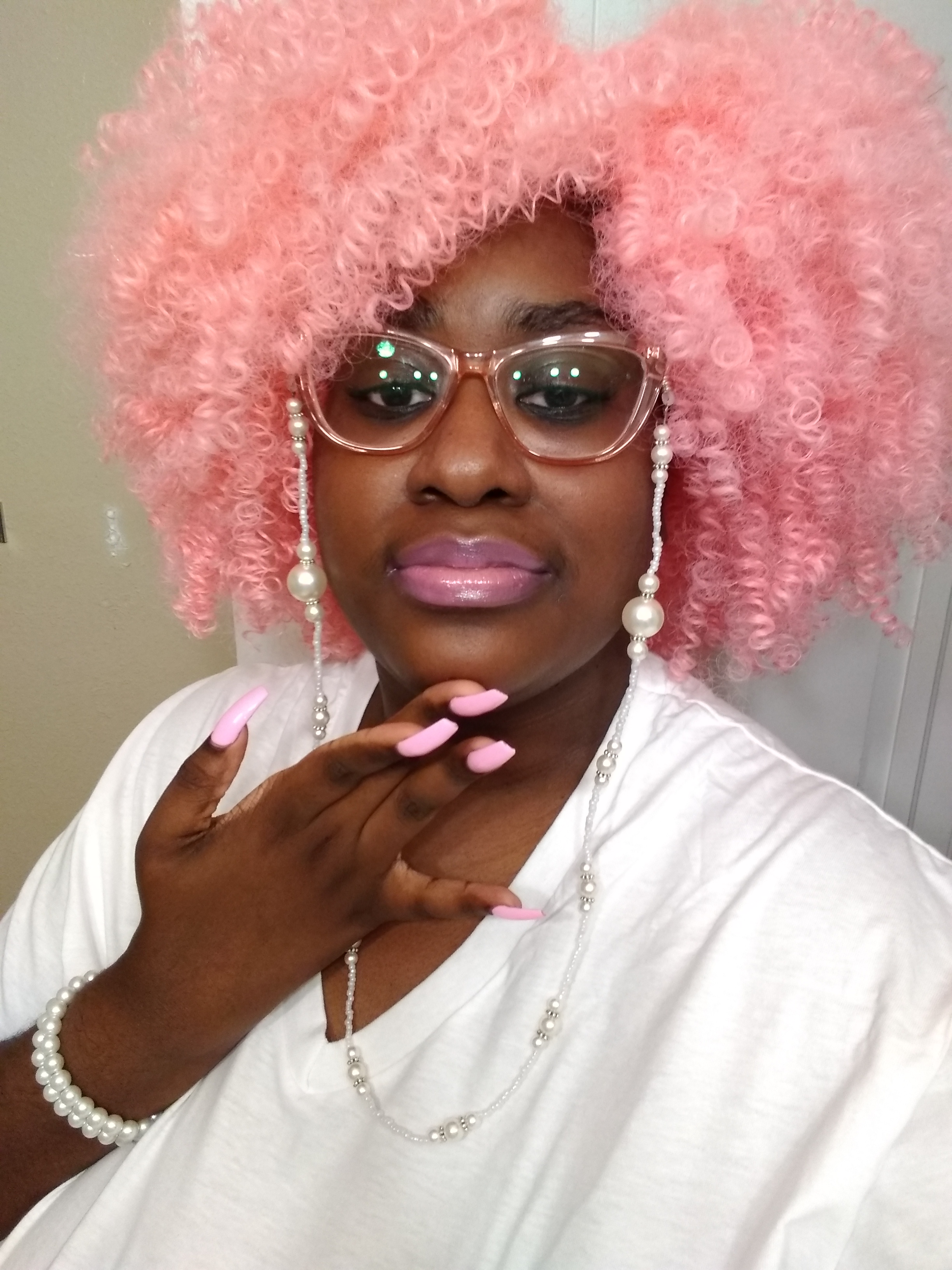 GOD, MY ABBAH, IS THE REASON, FOR ME, TRYING NEW CREATIVE WAYS, TO EXPRESS MY LOVE, FOR FASHION, AND TO CONNECT, WITH OTHER PEOPLE. TO FINALLY FEEL, INCLUDED WITH SOMETHING. AS YOU CAN TELL, I HAD SO MUCH FUN DOING, THE ALL PINK THING. IT’S WHAT, I WANTED TO DO, FOR ALONG TIME. I’VE ALWAYS WANTED, TO HAVE THE RIGHT GRADE, OF HAIR, TO GO NATURAL, TO BE PARDONED FROM NEGATIVE COMMENTS, ON THE ASSOCIATION, OF MY HAIR, AND THE COLOR, OF MY SKIN, FROM SCHOOL, OF PEERS. AND THEN AT HOME, WITH FAMILY. SO THE HAIR, (WIG) REALLY MADE ME SMILE. NEXT THE GLASSES, I’VE BEEN WANTING CATEYE GLASSES, AND TO WEAR PINK GLASSES, INSTEAD OF BLACK FRAMES, DESIGNER FRAMES, THAT WERE HAND ME DOWNS, FROM MY AUNT HARLONDA, THAT REALLY DIDNT REPRESENT MYSELF. AND HOW I WANTED, TO FEEL FASHIONABLY, AND TRENDY, IN WHAT, COULD HAVE BEEN A FASHION STATEMENT, FOR ME TO ESCAPE IN, FROM BAD EXPERIENCES FROM SCHOOL. BUT A REMINDER, THAT I NEEDED, CONTACTS, MAKEUP. AND I JUST, DIDN’T WANT TO WEAR THEM, IN JR. HIGH, AND HIGHSCHOOL, AT ALL.
