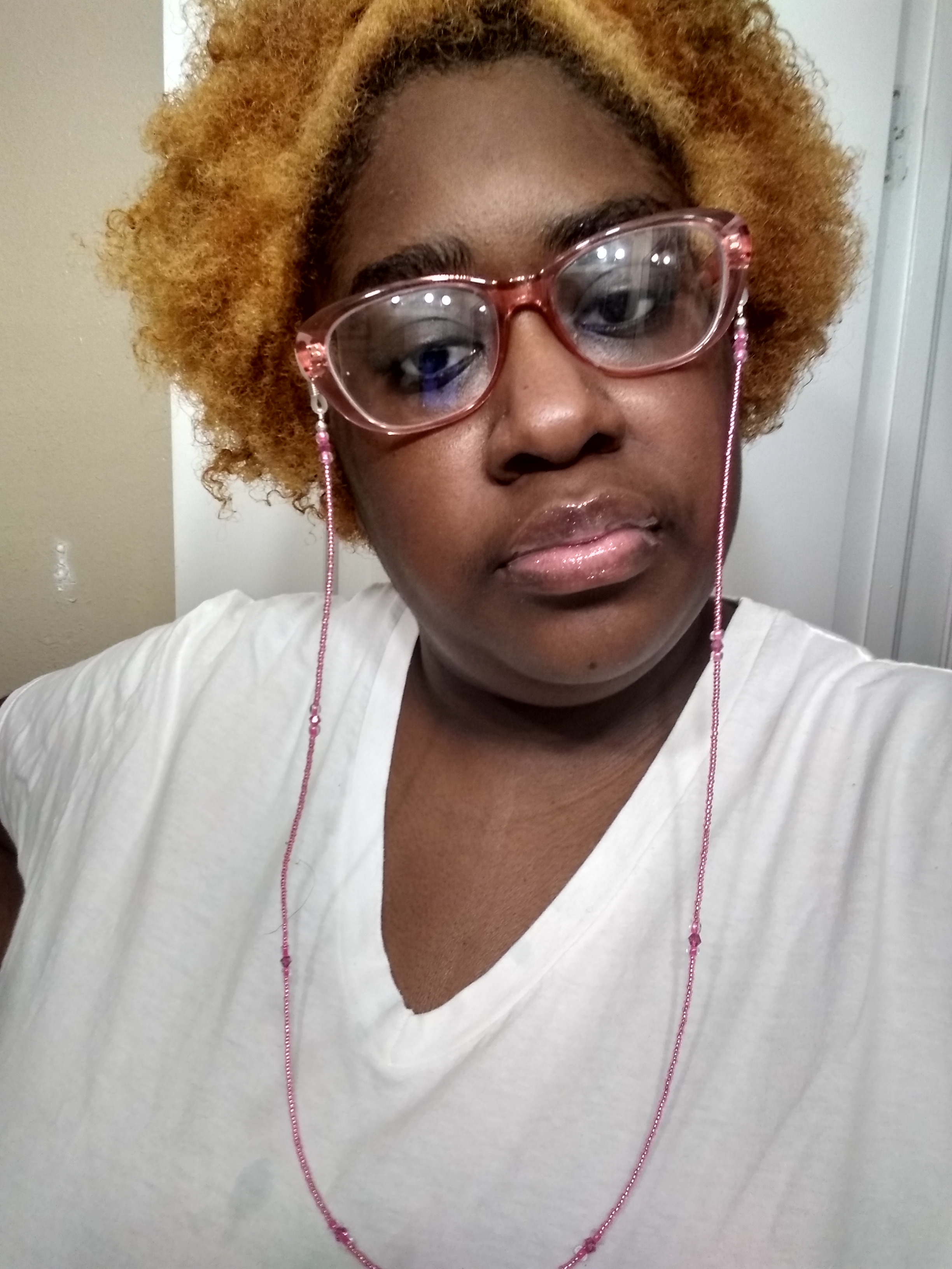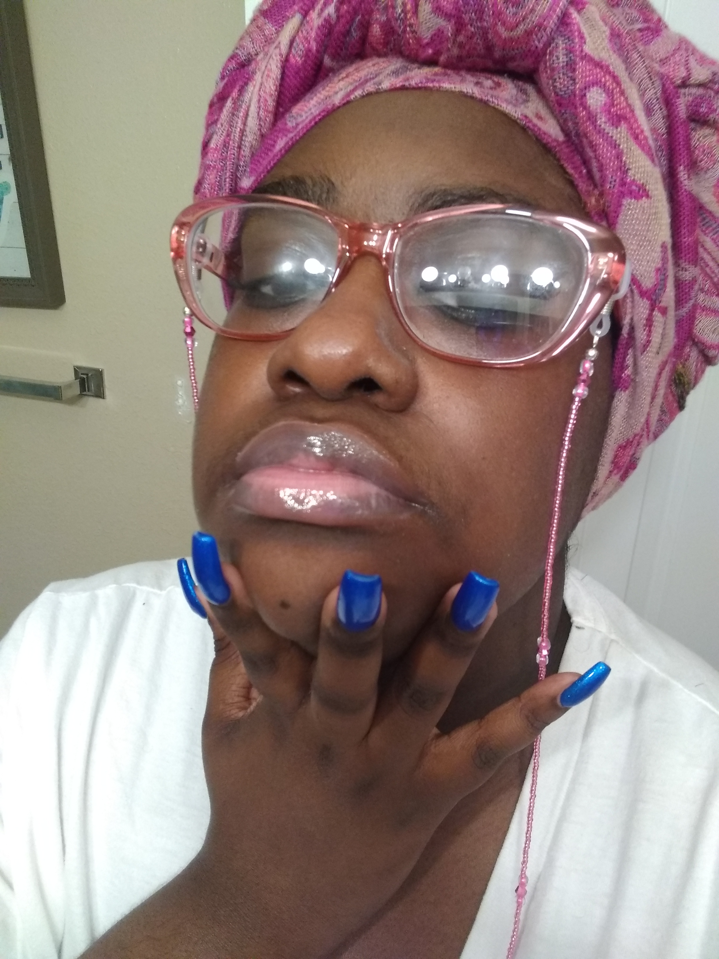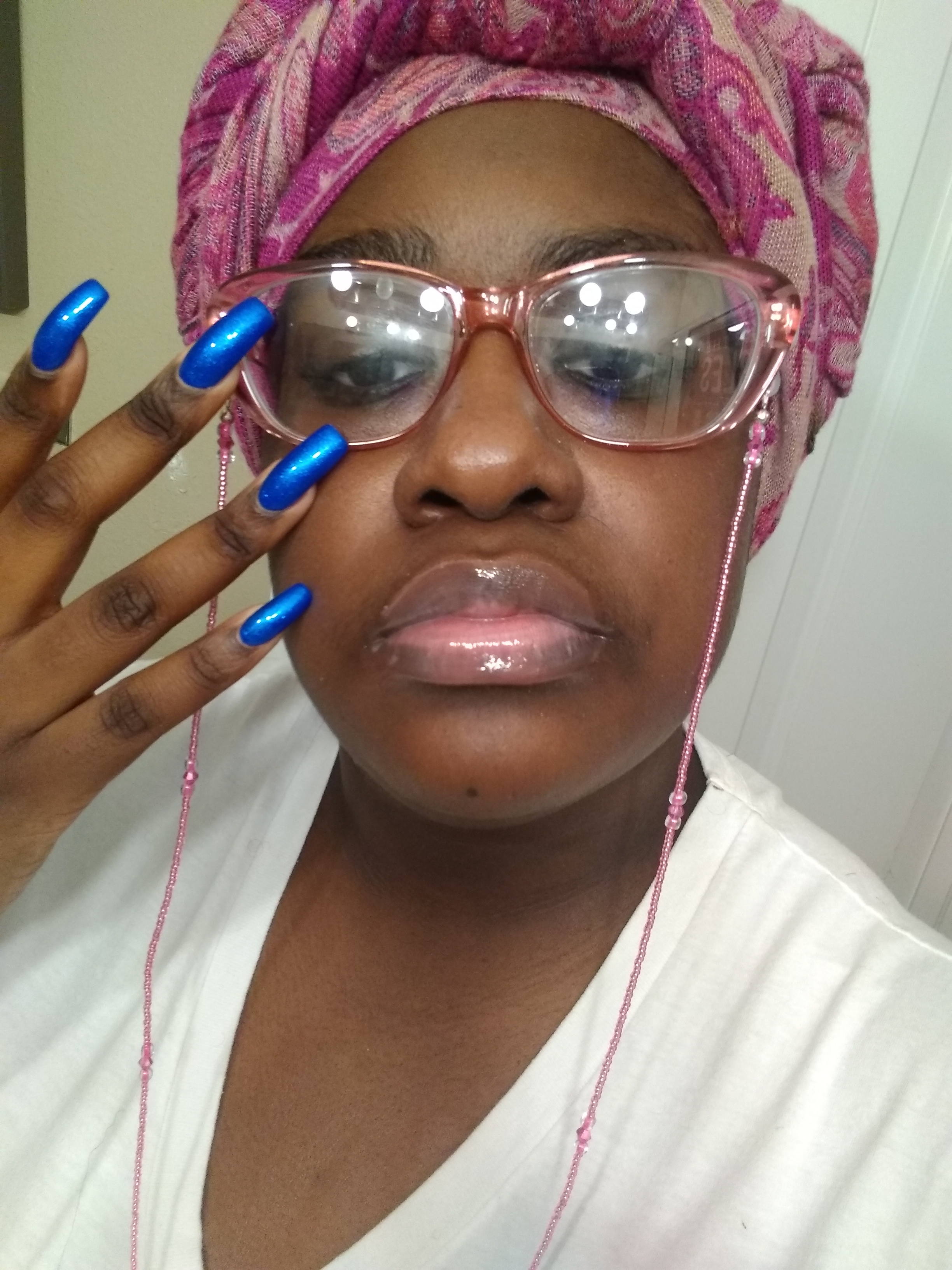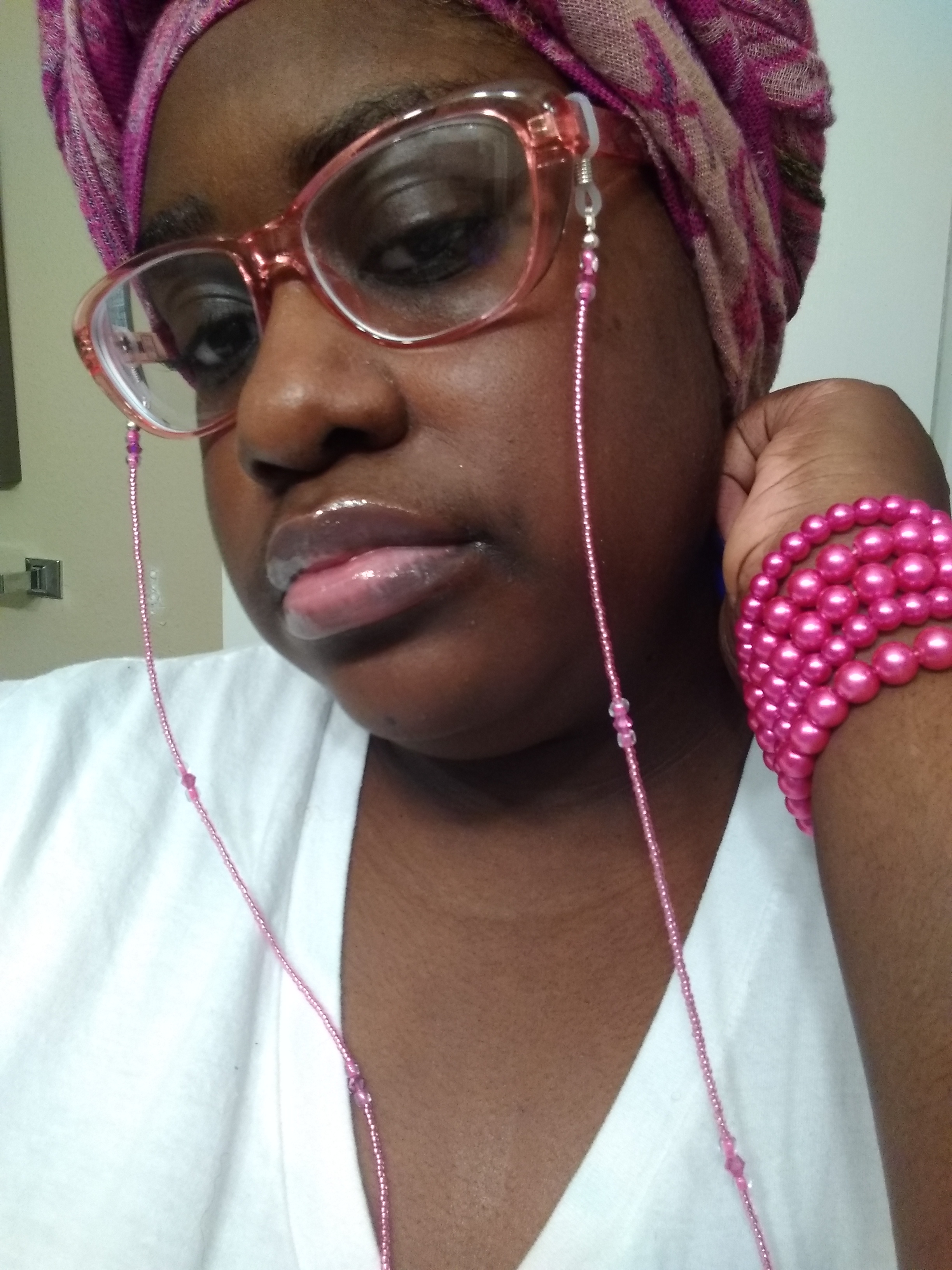 THERE’S SO MANY WAYS, TO STYLE YOUR GLASSES, FOR ME MY GO-TO ACCESSORY. FOR MY GLASSES, ARE BEADED AND JEWELED EYEGLASS CHAINS. HERE I AM PICTURED, WITH A BARBIE PINK BEADED EYE GLASS CHAIN, THAT COMPLIMENTS, THE PINK GLASS, OF THE FRAME. I PAIRED THE EYE CHAIN, WITH A FUCHSIA-PRINT PASHMINA HEADWRAP. THAT I’M WEARING AS A HIJAB. I PAIRED THE EYEGLASS CHAIN, WITH BARBIE-PINK PEARLS, AND MY FAVORITE SHEER, SHIMMERY LIP GLOSS. AND MY PEACOCK ELECTRIC BLUE NAILS.