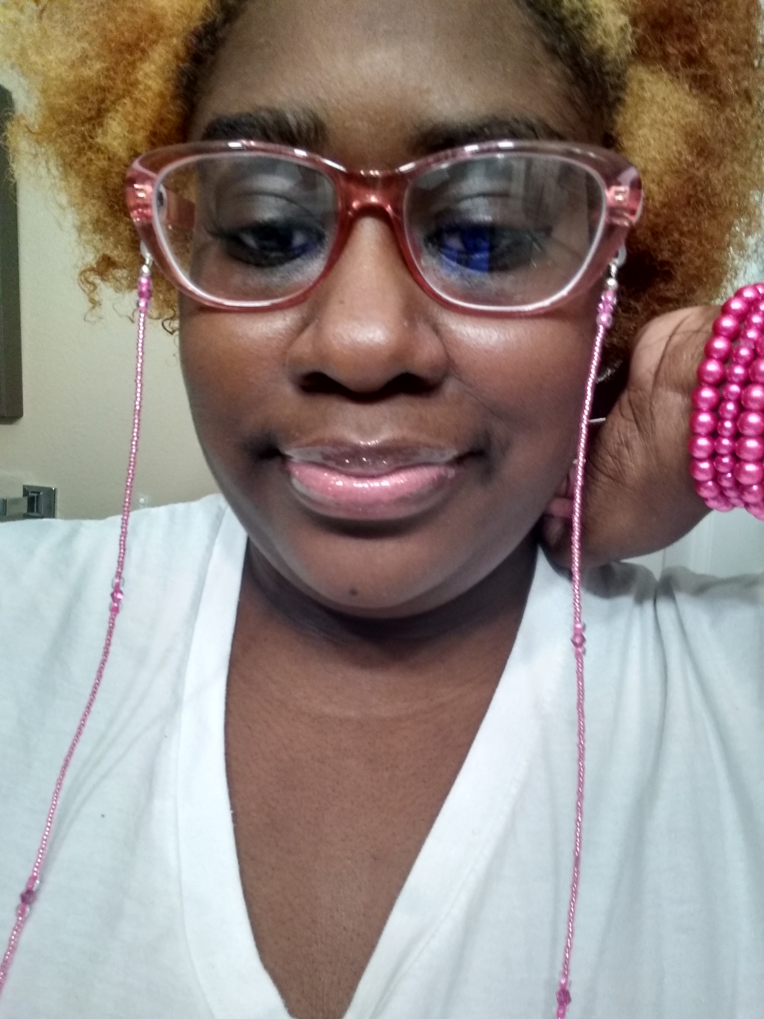 FOR THE PICTURES, BELOW, LIKE THE FIRST ALBUM, OF PHOTOS, I PAIRED MY OMBRE BLONDE HAIR, WITH THE PINK GLASSES, AND THE BARBIE PINK EYEGLASS CHAIN, TO MATCH THE BARBIE PINK PEARLS, AND I FINISHED THE LOOK OFF, WITH SHEER, SHIMMERY LIPGLOSS, AND PEACOCK ELECTRIC BLUE NAILS