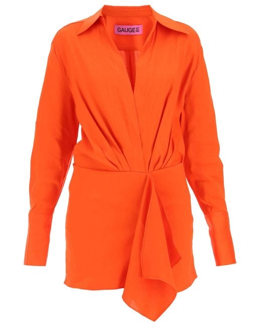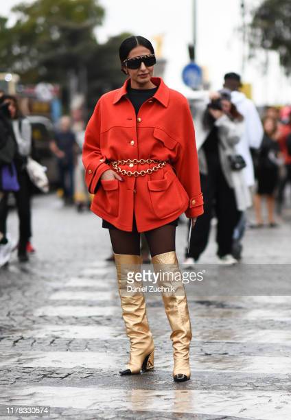 NAUSHEEN SHAH, IS PICTURED, ABOVE WEARING, AN ORANGE COAT, WITH A GOLD CHAIN BELT, THAT SHE PAIRED, WITH GOLD THIGH HIGH BOOTS. FOR HER ACCEDSSORIES, SHE PAIRED THE OUTFIT, WITH BLACK EMBELLISHED SUNGLASSES.
