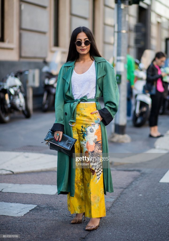 NAUSHEEN SHAH, IS WEARING A SILK GREEN COAT WITH THE BELT, TIED AROUND, A WHITE TEE, THAT SHE PAIRED, WITH YELLOW-MULTI-COLOR PRINT, SILK PANTS, AND BROWN SNAKESKIN PUMPS. FOR HER ACCESSORIES, SHE PAIRED, BLACK ROUND SUNGLASSES, AND A BLACK CROC-EFFECT CLUTCH. LOVE THIS OUTFIT, SO MUCH, I HAD TO RECREATE, THE ASIAN ELEMENTS, OF IT IN A CREATIVE WAY.