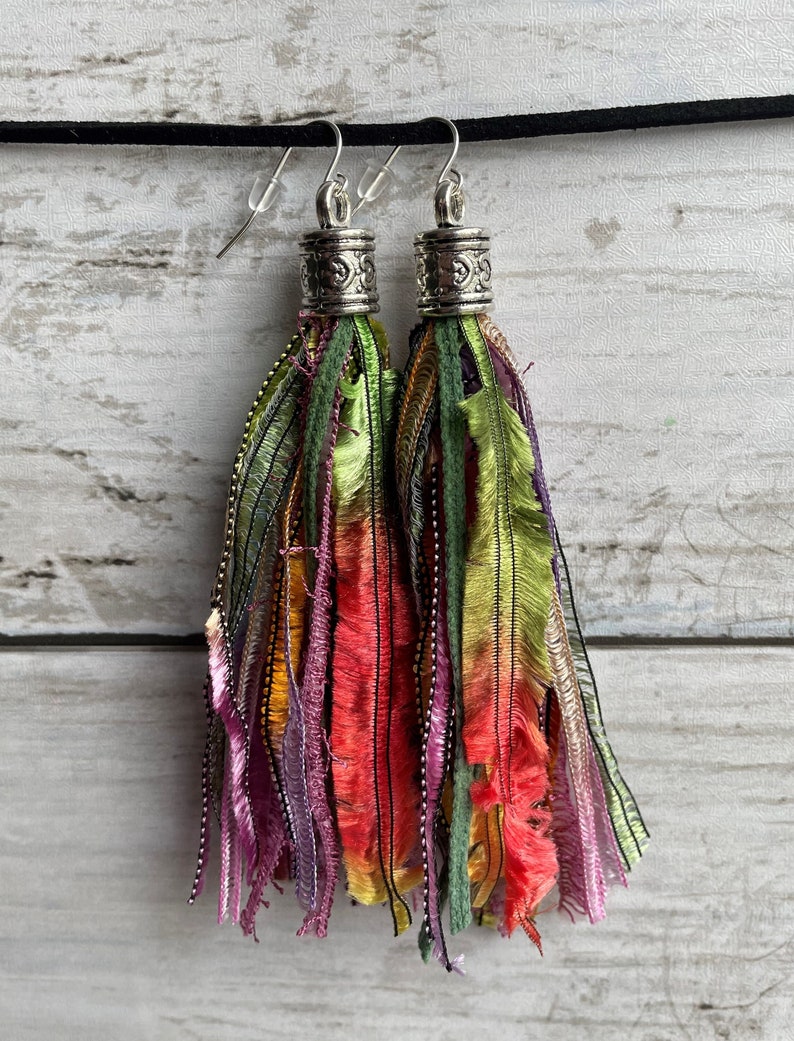 SO HERE I PAIRED, BARBIE-PINK LIPSTICK, WITH ETSY AMYSACCESSORIESLLC, GREEN, ORANGE, AND RED FEATHER EARRINGS, WITH A LOUISA BALLOU, ORANGE PRINT MESH TOP. THAT WILL BE PAIRED, UNDERNEATH A BARBIE PINK CORSET BRA TOP, PAIRED WITH A GREEN LEATHER SKIRT, RED TIGHTS, PINK AND WHITE KNEE-HIGH SOCKS, AND ORANGE, AND RED, LEOPARD PRINT PUMPS.