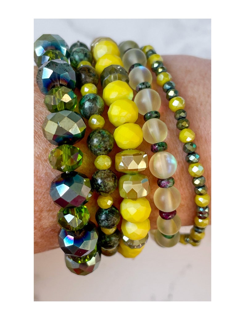 FOR THE REST, OF THE ACCESSORIES, AND JEWELRY, I PAIRED PLUM- PURPLE AND RED TONED CRYSTAL CLUTCH, WITH ETSY GAUDIDAZZLES, GREEN AND YELLOW, BEAD BRACELETS, STACK ON HAND. AND ON THE OTHER HAND, I PAIRED ETSY DIVIDREAM, GREEN STONE BRACELETS STACK. TO BRING OUT THE COLORS, IN THE EARRINGS, AND TIE THE OUTFIT TOGETHER, AS A WHOLE.