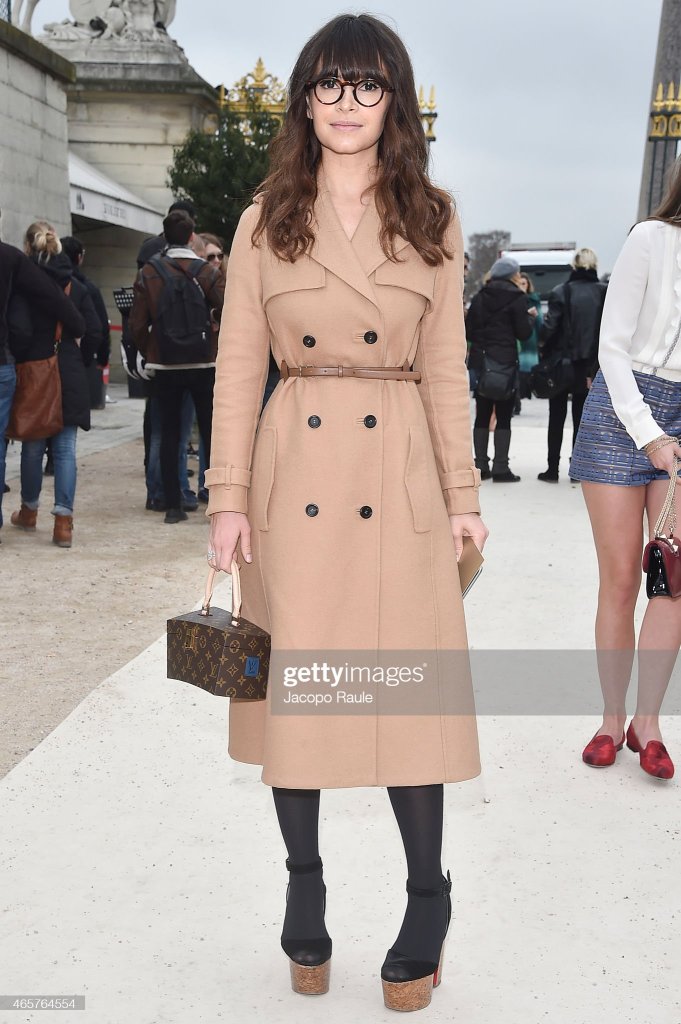 SO PICTURED ABOVE, MIROSLAVA DUMA IS WEARING HER SIGNATURE BROWN TRENCH COAT, AS A DRESS, THAT SHE PAIRED, WITH A BROWN BELT, BLACK TIGHTS, AND CORK BLACK PLATFORM SANDALS. SHE’S ACCESSORIZED THE OUTFIT, WITH A SKINNY BROWN PATENT BELT, TORTOISE OPTICAL GLASSES, AND A LOUIS VUITTON, MINI BOX BAG.
