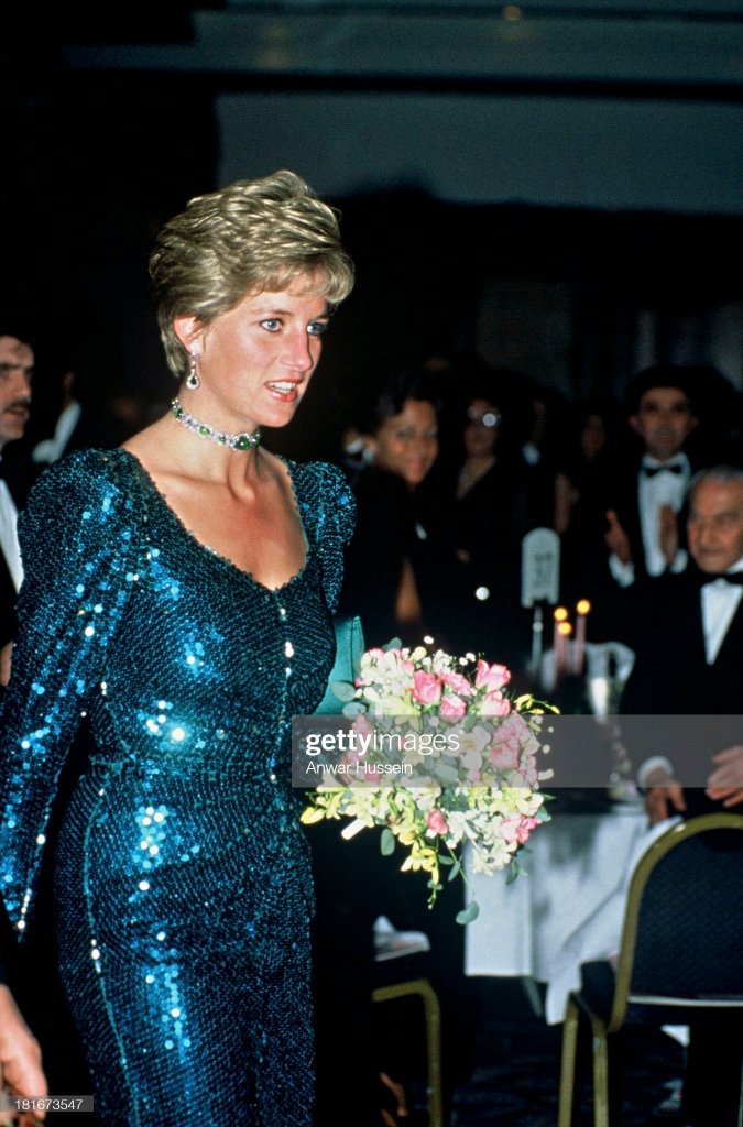 PRINCESS DIANA, IS WEARING, A SEQUINED, LONG SLEEVE PEACOCK-TEAL GOWN, THAT SHE PAIRED, WITH EMERALD GREEN EARRINGS, AND AN EMERALD GREEN CHOKER NECKLACE. SHE IS PICTURED, CARRYING, A TEAL SATIN CLUTCH. I AM UNSURE, OF WHAT SHOES, SHE HAS PAIRED, WITH THIS OUTFIT, AND I’M THINKING, MAYBE TEAL, OR METALLIC PUMPS.