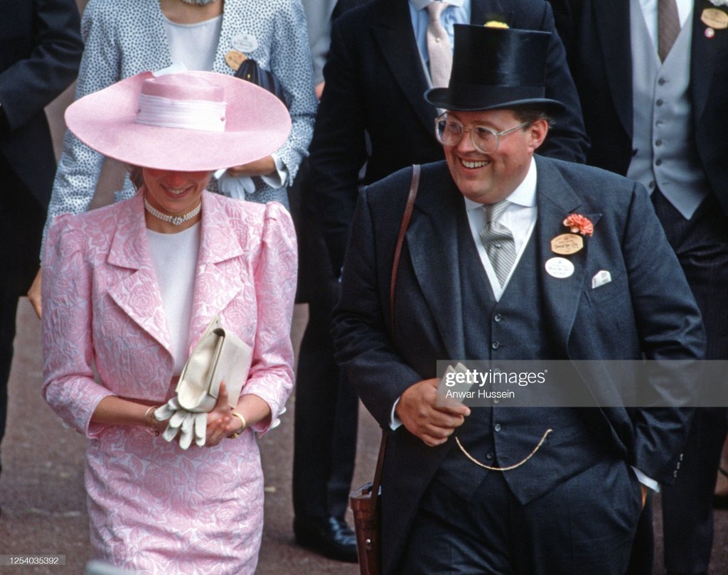 SOMETHING ABOUT THIS OUTFIT, JUST EMPHASIZES, A PLAY ON A BARBIE THEME, OR A BARBIE CAKE, IS WHAT IT REMINDS ME OF, BECAUSE OF THE BRIGHTNESS, OF THE BRIGHT, BARBIE-PINK AGAINST THE WHITE. THIS IS ALSO, ONE OF MY FAVORITE OUTFITS, FROM PRINCESS DIANA, BECAUSE IT MAKES ME THINK, OF BARBIE, OR SOMETHING, A BARBIE DOLL, WOULD WEAR. LET’S GET INTO, WHAT SHE’S WEARING. A PINK AND WHITE HAT, WITH A CROPPED PINK, JACQUARED JACKET, A WHITE BLOUSE, TUCKED INSIDE, A PINK JACQUARD, BROCADE PRINT SKIRT. AND IN THE PHOTO, SHE IS HOLDING HER WHITE GLOVES, AND HER WHITE CLUTCH. IT IS UNSPECIFED, WHAT COLOR, HER SHOES WERE. I’M THINKING, MAYBE WHITE PUMPS, OR PINK PUMPS.