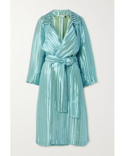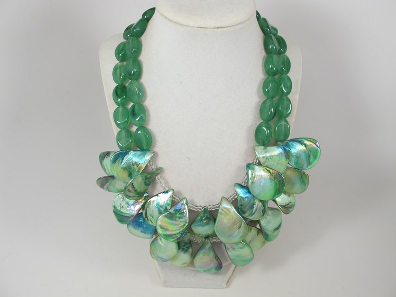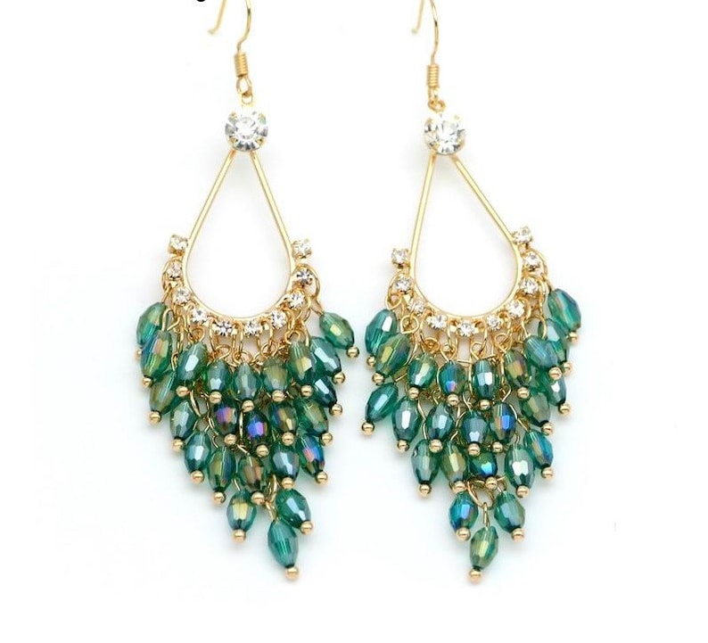 I DECIDED, TO RECREATE THIS LOOK, I PAIRED ETSY ONECHARMINGTREASURE, GREEN IRIDESCENT CHANDELIER EARRINGS, WITH AN ETSY OXANAJEWELRYDESIGN, GREEN BEAD STATEMENT NECKLACE. THAT I PAIRED, WITH THE ROW, BLUE JACQUARD BROCADE, METALLIC COAT, WITH GUISEPPE DI MORABITO, BLUE PANTS, WITH BLUE TIGHTS UNDERNEATH, AND GREEN SLING-BACK POINTED TOE PUMPS.