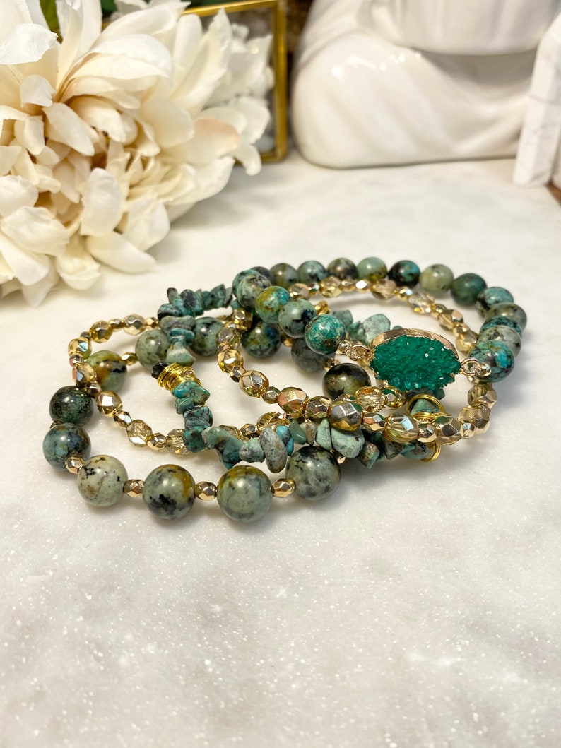FOR THE REST, OF THE ACCESSORIES, AND THE JEWELRY, I PAIRED A LIME GREEN BROOCH, EMBELLISHED HANDBAG, WITH ETSY OXANAJEWELRYDESIGN, GREEN STONE BEAD BRACELET, PAIRED WITH ETSY DIVIDREAM, GREEN TURQUOISE STONE, AND BEAD BRACELETS STACK.