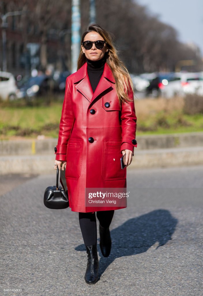 I JUST ABSOLUTELY, LOVE THIS OUTFIT, IM NOT BIG ON RED, BUT I LOVE THIS COAT MIROSLAVA DUMA, IS WEARING. I LOVE THE BUTTON DETAIL, THE MOST, ABOUT THIS COAT. I ALSO LIKE, THE KIND OF LEATHER, IT IS MADE FROM. WHAT I LIKE THE MOST, ABOUT MIROSLAVA DUMA’S OUTFIT, IS SHE ALLOWED, THE COAT, TO BE FOCAL POINT, OF THE OUTFIT, BY THE WAY SHE STYLED IT. SO LET’S DISCUSS HER OUTFIT, MORE IN DEPTH. MIROSLAVA DUMA, PAIRED HER RED COAT, WITH THE DRAMATIC BUTTON EMBELLISHMENTS, WITH A BLACK TURTLENECK SWEATER, BLACK LEGGINGS, AND BLACK ANKLE BOOTS. SHE ACCESSSORIZED, HER OUTFIT, WITH BLACK SUNGLASSES, AND A BLACK CLUTCH PURSE.