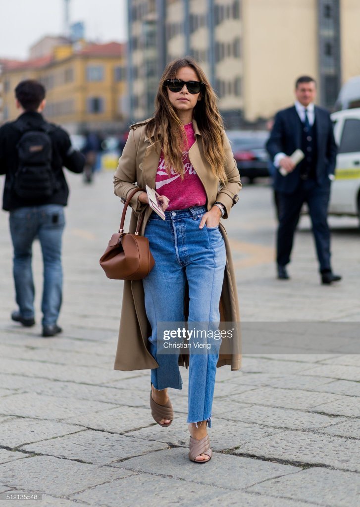 MIROSLAVA DUMA, IS WEARING, SHALL WE. MIROSLAVA DUMA, IS WEARING A BROWN OPEN TRENCH COAT, OVER A COCA COLA GRAPHIC TEE, TUCKED INTO HIGH-WAISTED DENIM JEANS, THAT SHE PAIRED, WITH BROWN MULES, SHE ACCESSORIZED, HER OUTIFIT, WITH BLACK SUNGLASSES, AND A BROWN FOLDED MINI HANDBAG. I DECIDED, TO RECREATE THIS LOOK.