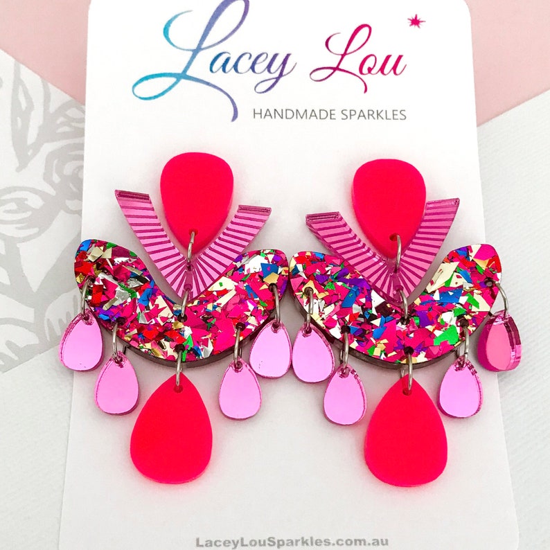 I PAIRED, ETSY LACEYLOUSPARKLES, MULTI-COLOR CHANDELIER EARRINGS, WITH AN ALEX PERRY, PINK CREPE BLAZER, OVER A NASTY GAL, GRAY AND PINK COCA COLA GRAPHIC TEE, TUCKED INTO A PACO RABBANE, PINK SEQUINED SKIRT, PAIRED OVER DOROTHEE SCHUMACHER, DENIM JEANS.