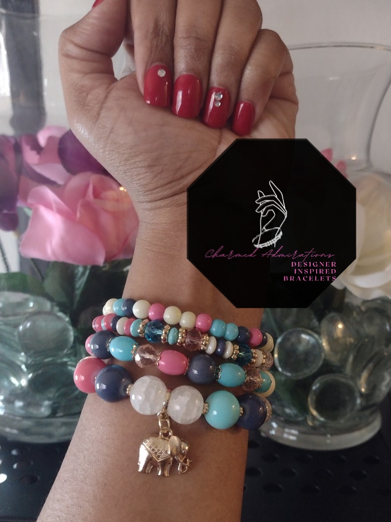 AND I PAIRED, BARBIE-PINK DOLCE AND GABBANA SNEAKERS, WITH THE OUTFIT. FOR THE REST, OF THE ACCESSORIES, AND JEWELRY, I PAIRED A MULTI-COLOR GEMSTONES, EMBELLISHED PINK BOX BAG, WITH ETSY CHARMEDADMIRATIONS, MULTI-COLOR ELEPHANT STACK BEAD BRACELETS, ON ONE HAND. AND ON THE OTHER HAND, I PAIRED ETSY GEMMESMADEWITHLOVE, BLUE MULTI-COLOR BEAD BRACELET STACK.