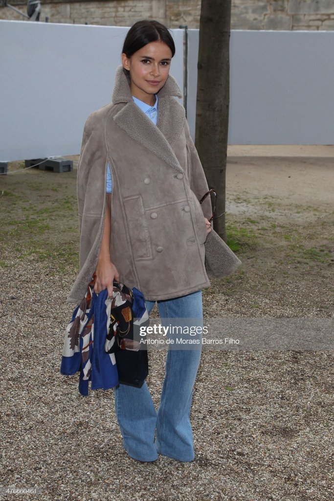 LET’S GET MORE IN DEPTH, OF WHAT MIROSLAVA DUMA, IS WEARING. MIROSLAVA DUMA, IS WEARING, A GRAY CAPE PEACOAT, THAT SHE PAIRED, OVER A BLUE BUTTON UP SHIRT, IN WHICH SHE PAIRED, LIGHT-WASH DENIM BELL BOTTOM JEANS, THAT SHE PAIRED, WITH PLATFORMS. I’M NOT SURE, WHAT COLOR, OR WHAT STYLE, SINCE HER JEANS, ARE DRAPED OVER HER SHOES. FOR HER ACCESSORIES, SHE PAIRED A BLACK HANDBAG, WITH A BLUE PRINT SCARF, TIED AROUND, HER HANDBAG. A TREND, VERY COMMON, IN PARIS FASHION.