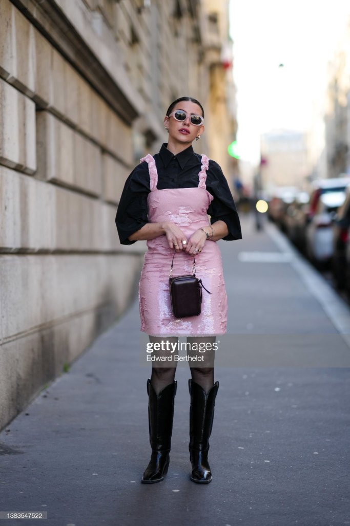 THERE ARE SO MANY REASONS, WHY I LOVE THIS LOOK, THIS PARIS STREET STYLIST, IS WEARING. BUT FIRST, LETS DISCUSS, HOW SHE STYLED HER OUTFIT. THE STYLIST, IS PICTURED ABOVE, WEARING A BLACK BUTTON-DOWN SHIRT, THAT SHE PAIRED, UNDERNEATH A DISTRESSED, SEQUINED BARBIE PINK STAP DRESS. SHE STYLED, HER OUTFIT, WITH SHEER BLACK TIGHTS, AND BLACK KNEE-HIGH WESTERN STYLE COWGIRL BOOTS. SHE ACCESSORIZED HER OUTFIT, WITH BROWN SUNGLASSES, AND A DARK BROWN MINI CROSS BODY BAG. I DECIDED TO RECREATE THE LOOK, OF THE BLACK TOP, UNDER A DETAILED DRESS. SO, LETS GET RIGHT TO IT, SHALL WE.
