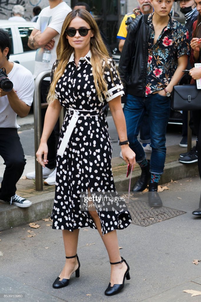 MIROSLAVA DUMA IS WEARING, A WHITE COLLARED, AND WHITE TRIM POLKA DOT BELTED DRESS, THAT SHE PAIRED, WITH CASUAL, BLACK ANKLE-STRAP PUMPS. FOR HER ACCESSORIES, SHE PAIRED HER GOLD-PLATED WATCH, AND OPTED FOR, BLACK SUNGLASSES. I DECIDED, TO RECREATE THIS LOOK.