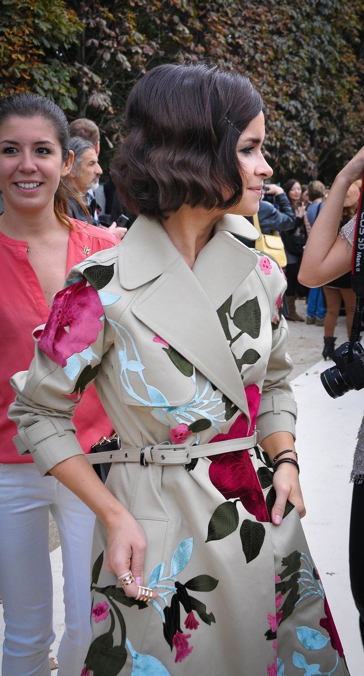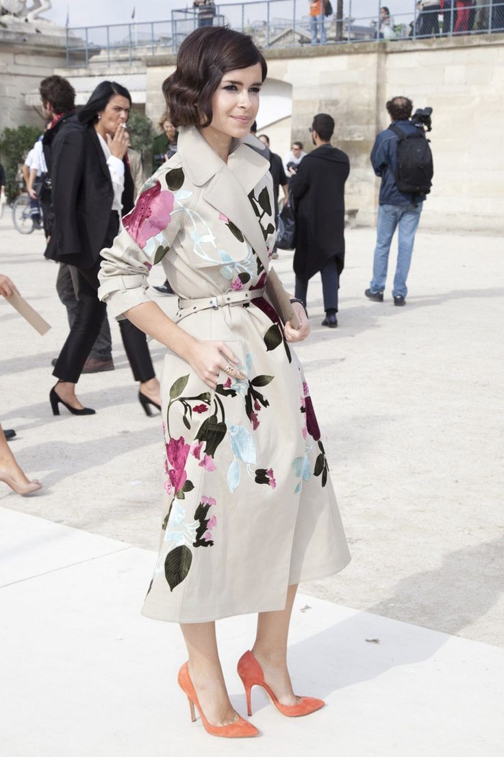 THIS IS ANOTHER OUTFIT, BY MIROSLAVA DUMA, THAT I LIKE. IN FACT, I THINK I RECREATED THIS LOOK, IN A PREVIOUS POST, I COULDN’T REMEBER, SO I DECIDED TO RECREATE IT AGAIN. I LOVE HOW MIROSLAVA DUMA, DRESSES WHEN ITS PARIS FASHION WEEK. LET’S GET INTO WHAT, SHE’S WEARING. MIROSLAVA DUMA IS PICTURED, WEARING A BELTED FLORAL COAT, THAT SHE IS WEARING AS A DRESS, SHE PAIRED THIS BEAUTIFUL COAT, WITH ORANGE SUEDE PUMPS. SHE ACCESSORIZED HER LOOK, WITH BLACK BRACELETS, AND GOLD STACKED RINGS.