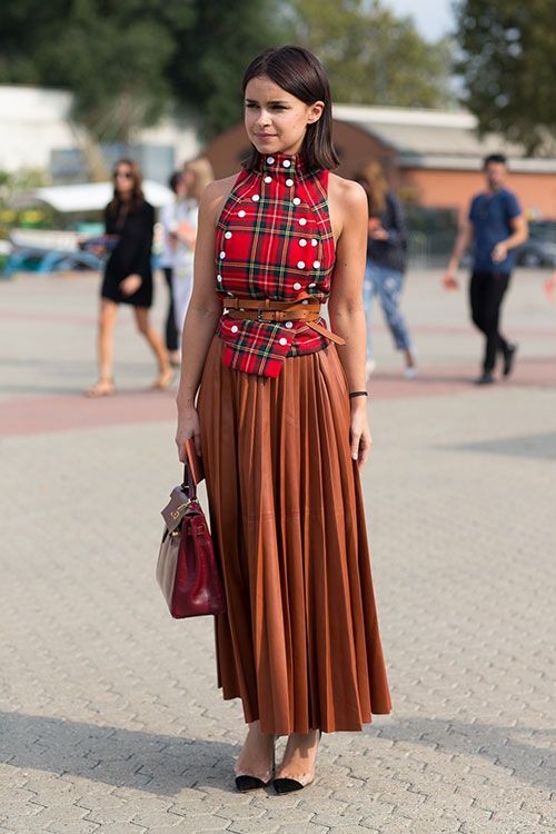 THIS IS SUCH A CHIC PLAY, ON PLAID PRINT, THAT I HAVE EVER SEEN, SO I HAD TO RECREATE THIS OUTFIT. LET’S DISCUSS, WHAT SHE IS WEARING. MIROSLAVA DUMA IS PICTURED WEARING A RED PLAID PRINT VEST, THAT SHE HAS STYLED WITH A TWO BROWN TIED BELTS, THAT SHE PAIRED, WITH A LEATHER PLEATED SKIRT, AND BLACK SUEDE PUMPS. FOR HER ACCESSORIES, SHE PAIRED A RED CROC-EFFECT, HERMES BIRKIN BAG, WITH A BLACL BRACELET. I DEICDED TO RECREATE THIS LOOK OF THE VEST PAIRED WITH THE LEATHER SKIRT.