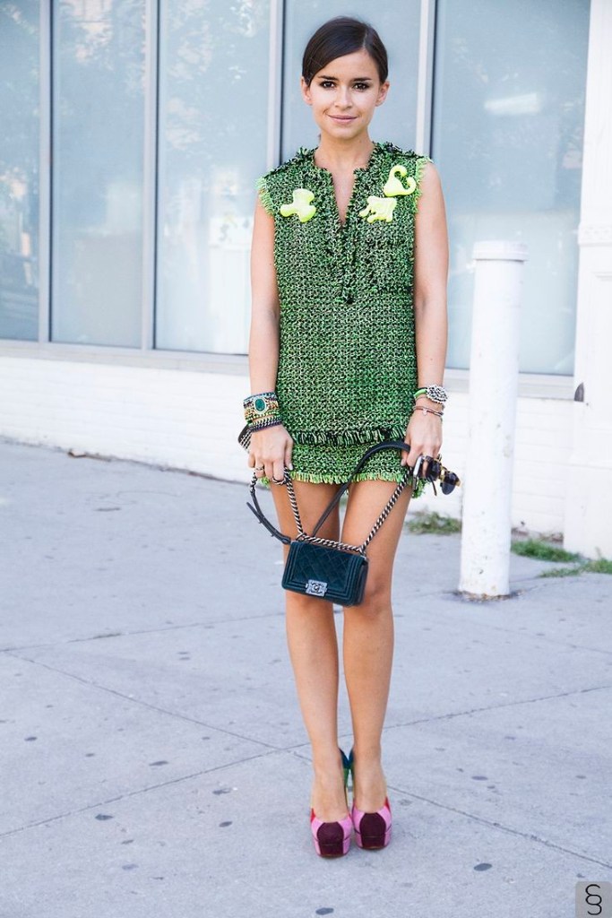 THE TWO COMPONETS, I LOVE ABOUT FASHION, WOULD BE TWEED, AND TWO TONE/ COLORBLOCK. SO, WHEN I CAME ACROSS THIS OUTFIT, MIROSLAVA DUMA IS WEARING, IN THE PICTURE ABOVE. I HAD TO RECREATE, AND I HAD SO MUCH FUN IN DOING SO. LET’S DISCUSS, WHAT MIROSLAVA DUMA. IS WEARING. SHE IS WEARING, A GREEN TWEED FRINGE DRESS, THAT SHE PAIRED WITH. MULTI-COLOR PLATFORM COLORBLOCK PUMPS. FOR HER ACCESSORIES, AND JEWELRY, SHE PAIRED THREE NEON YELLOW BROOCH PINS ON HER DRESS. AND STACKED BOHO BANGLES. I DECIDED TO RECREATE THIS LOOK, OF THE TWEED DRESS. AND THE BOLD COLORED SHOES.