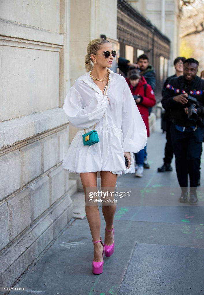 THIS HAS TO BE ONE OF MY FAVORITE LOOKS, THAT THIS WOMAN IS PICTURED WEARING, SIMPLY BECAUSE OF HOW DOLL, LIKE THE SHOES LOOK, OF BARBIE PINK. AND EVERYONES KNOWS, HOW I FEEL ABOUT PINK, BEING MY FAVORITE COLOR, AND EVERYTHING BARBIE. LET’S GET INTO MORE DEPTH, OF WHAT SHE IS PICTURED WEARING. THE WOMAN IN THE PICTURE, HAS ON BLACK GLASSES, THAT SHE PAIRED, WITH A WHITE PUFF SLEEVED DRESS, THAT SHE PAIRED, WITH BARBIE-PINK ANKLE STRAP MARY JANE PLATFORMS. FOR HER ACCESSORIES, AND JEWELRY., SHE PAIRED A GOLD CHUNKY CHAIN NECKLACE, WITH BLACK SUNGLASSES, AND A TEAL GREEN MINI TOTE BAG. I THINK THE WINNER OF THIS OUTFIT, ONCE AGAIN HAD TO BE THE PLATFORMS, AGAINST HER TAN COMPLEXION, IT GIVES BARBBE VIBES TO WHOMEVER WEARS THIS PARTICULAR HUE OF A SHOE WOULD LOOK GREAT ON ALL COMPLEXIONS, SO THAT ITS WINNER FOR ME. I HAD TO RECREATE THIS LOOK, THE PUFFY WHITE DRESS, AND THE PATENT PINK PLATFORMS.