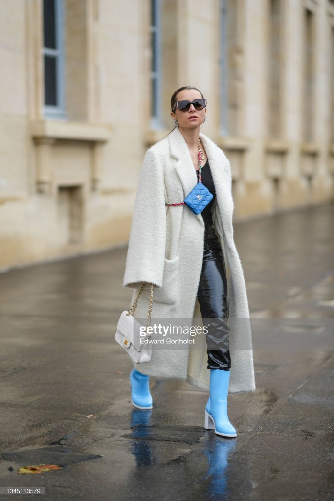 I LOVE, LOVE, LOVE THE SHOES, PICTURED ABOVE. LET’S GO INTO DEPTH OF WHAT THIS FASHION WEEK STREET STYLIST, IS WEARING. THE WOMAN, IN THE PICTURE, IS WEARING A WHITE FLEECE COAT, PAIRED OVER A BLACK TANK, THAT IS TUCKED INTO BLACK PATENT LEATHER PANTS, THAT SHE PAIRED WITH WHITE PLATFORM, BRIGHT BLUE ANKLE BOOTS. FOR HER ACCESSORIES, AND HER JEWELRY, SHE PAIRED BLACK SUNGLASSES, GOLD CHANDELIER EARRINGS, WITH A CROSS-BODY BLUE. MINI CHANDEL BAG, ACROSS HER TORSO, AND A WHITE CHANEL HANDBAG. MY FAVORITE PART ABOUT THIS LOOK, WOULD HAVE TO BE THE PATENT LEATHER PANTS, PAIRED WITH THOSE JAZZY BRIGHT BLUE WHITE PLATFORM BOOTS. I’M REALLY, REALLY, OFFICIALLY OBSESSED, WITH HER SHOE CHOICE. SO MUCH, I DECIDED TO RECREATE THIS LOOK, OF THE PATENT LEATHER PANTS, PAIRED WITH THE ANKLE BOOTS. I PAIRED A MULTI-COLORED EMBELLISHED TURBAN, WITH ETSY BLUE CHANDELIER EARRINGS, WITH PINK SUNGLASSES, THAT I PAIRED WITH A VALENTINO, METALLIC BROCADE COAT. THAT I PAIRED WITH A BLUE CRYSTAL EMBELLISHED BELT, AROUND THE COAT, PAIRED WITH BARBIE- PINK PATENT PANTS, HARAJUKU BLUE STRIPED KNEE HIGH SOCKS, AND GOLD EMBELLISHED WESTERN ANKLE PLATFORM BOOTS. FOR THE REST, OF THE ACCESSORIES, AND THE JEWELRY, I PAIRED A BROWN DRAPED CHAIN, SCARF HANDLE MINI HANDBAG, WITH ETSY BLUE, AND GOLD CHUNKY, STONE STACKED BRACELETS.