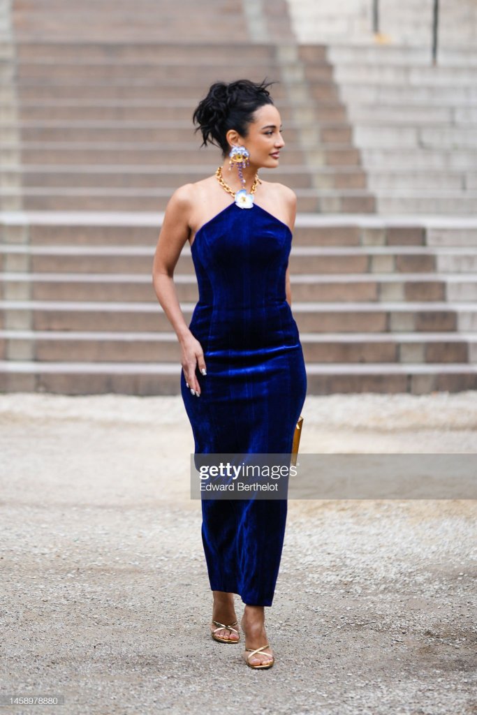 AMINA MUADDI SHOWS YOU ALL THE VERSATILE WAYS, SHE CAN STYLE, AND THE DIVERSITY, OF HER STREET WEAR AND STYLE AS A WHOLE IN GENERAL. THIS IS ANOTHER, ONE OF MY MANY FAVORITE LOOKS, BY THE FASHION STYLIST, AND DESIGNER. SHE IS WEARING, A BLUE VELVET HALTER-NECK DRESS, WITH A GOLD CHAIN TIE DETAIL, HELD BY A WHITE FLOWER. SHE PAIRED HER DRESS, WITH GOLD SANDALS HEELS. FOR HER ACCESSORIES, AND JEWELRY, SHE PAIRED A GOLD CLUTCH, AND BLUE PEARL CLUSTER AND BEAD CHANDELIER EARRINGS. I DECIDED TO RECREATE HER LOOK, OF THE BLUE HALTERNECK DRESS, AND VERY INTRICATE ACCESSORIES, AND JEWELRY