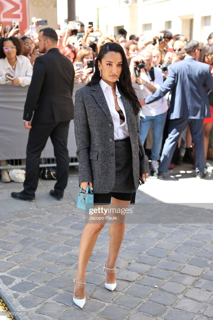 I LIKE THE PROFESSIONAL, YET SULTRY CHIC LOOK, AMINA MUADDI IS DOING HERE. THIS IS ALSO ONE OF MY FAVORITE LOOKS. BUT BEFORE WE DISCUSS THAT, LET’S FRIST GET INTO WHAT SHE’S WEARING SHALL WE. AMINA MUADDI IS PICTURED, WEARING AN OVERSIZED WOOL BLAZER, OVER A WHITE UNBUTTONED COLLARED SHIRT OVER A LACE BLACK BUSTIER, THAT SHE HAS TUCKED, INTO A MATCHING WOOL MINI SKIRT, WITH BLACK LEGGING SHORTS PEAKING, FROM THE HEM OF THE SKIRT. SHE PAIRED HER OUTFIT WITH CRYSTAL ANKLE STRAP WHITE PUMPS. FOR HER ACCESSORIES AND JEWELRY, SHE PAIRED SILVER CHANDELIER EARRINGS, AND BLUE QUILTED PATENT, MINI, MINI, HANDBAG.