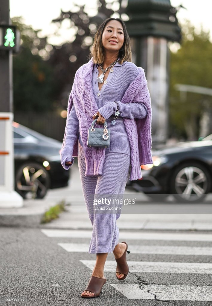 SHE IS PICTURED WEARING A LAVENDER KNIT CARDIGAN CAPE OVER A PURPLE CASHMERE SWEATER WITH PURPLE CASHMERE MATCHING PANTS. SHE PAIRED HER OUTFIT WITH BROWN MULES AND A LAVENDER GRAY MINI HANDBAG. SO, I DECIDED TO RECREATE THIS LOOK, OF THE PURPLE RIBBED CARDIGAN WORN AS A CAPE OVER THE PURPLE SWEATER.