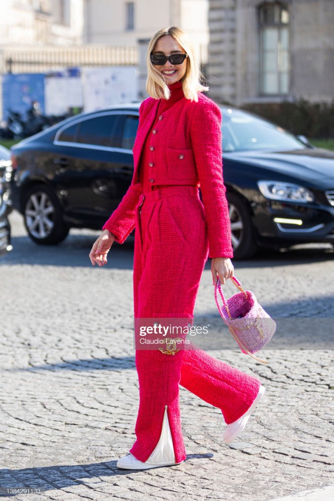 THIS MY SOUND CLICHE, A BIT CRAZY AND UNBELIEVABLE, IF YOU MUST, BUT THIS IS ONE OF MY MOST FAVORITE PARIS FASHION WEEK LOOKS. I LOVE EVERYTHING ABOUT THIS LOOK. THERE’S SO MANY WAYS, YOU CAN RECREATE THIS OUTFIT. SO, WITHOUT FURTHER OR DO, LET’S DISCUSS, WHAT THIS PARIS STREET STYLIST, IS WEARING. THIS FASHION STREET STYLIST IS WEARING, A HOT-PINK TWEED JACKET, OVER A HOT-PINK TURTLENECK LONG SLEEVE TOP, TUCKED INTO HOT-PINK TWEED PANTS, AND WHITE SNEAKERS, TO BRING OUT THE WHITE ZIPPER PART, OF THE PANTS. FOR THE REST OF THE ACCESSORIES, SHE PAIRED BLACK SUNGLASSES, AND A BARBIE-PINK TWEED BUCKET BAG.