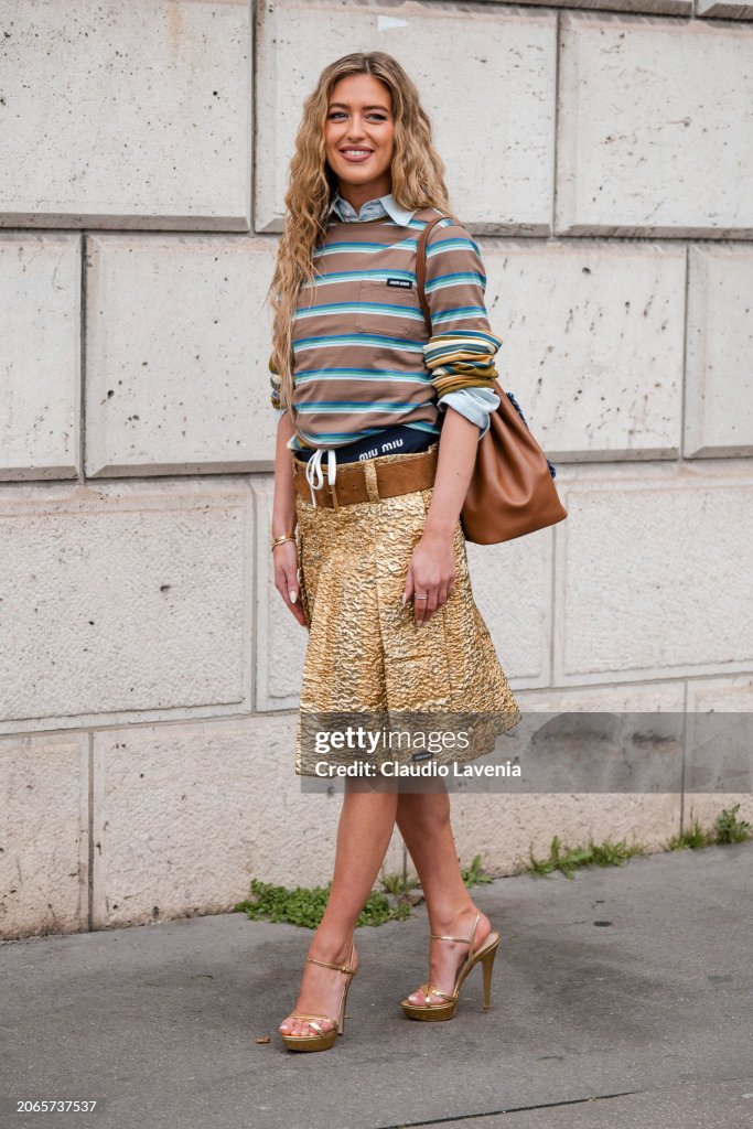 THIS LOOK EMILI SINDLEV IS WEARING IS A VERY PREPPY STYLE LOOK THAT I JUST HAVE TO DISCUSS. EMILI IS WEARING A BLUE COLLARED SHIRT, UNDERNEATH A BROWN SHIRT, WITH BLUE STRIPES, THAT SHE PAIRED WITH MIU MIU SHORTS OVER A JACQUARD GOLD SKIRT, WITH WIDE BROWN WAIST BELT, AND GOLD PLATFORM SANDAL HEELS. FOR HER ACCESSORIES SHE PAIRED A BROWN BUCKET BAG, AND GOLD BANGLES. I DECIDED TO RECREATE THIS LOOK, OF THE STRIPED SHIRT, AND THE JACQUARD SKIRT. SO, LETS GET INTO IT.