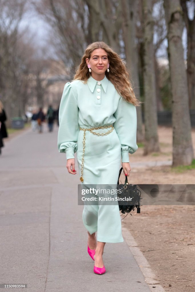 THIS LOOK THAT EMILI SINDLEV IS WEARING JUST SCREAMS VINTAGE! VINTAGE! VINTAGE! AND I AM ALL HERE FOR VINTAGE STYLE DRESSES LIKE THIS MINT GREEN ONE. THAT SHE PAIRED WITH PEARL DROP EARRINGS. SHE PAIRED THE VINTAGE STYLE DRESS WITH GOLD CHAIN WAIST BELT, PINK PUMPS AND A BLACK HANDBAG. FOR I DECIDED TO RECREATE THE PUFF SHOULDER DRESS LOOK, IN MY OWN WAY SO LET’S GET TO IT.