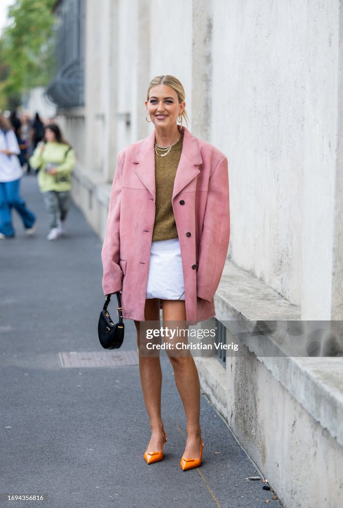 THIS OUTFIT THAT EMILI SINDLEV IS WEARING IS SO CHIC ITS HONOR OF ALL THE FALL COLORS AND TONES WILL BE SEEING AFTER THIS WINTER/FALL FASHION WEEK I’M SURE. LET’S DISCUSS WHAT SHE IS WEARING. EMILI IS WEAIRNG A ROSE PINK SUEDE OVER-SIZED BLAZER THAT SHE PAIRED OVER A BROWN SWEATER PAIRED WITH A WHITE SKIRT AND ORANGE PUMPS. MY FAVORITE ASPECT OF THIS OUTFIT WOULD BE THE WAY THE OVER-SIZED JACKET COMPLIMENTS THE FALL COLORED SWEATER AND THE WAY THE ORANGE SORT OF TIES THESE COLORS TOGETHER THE WHITE SERVING AS SORT OF THE BRIDGE BETWEEN WINTER/FALL TRANSITIONING INTO SPRING/SUMMER.